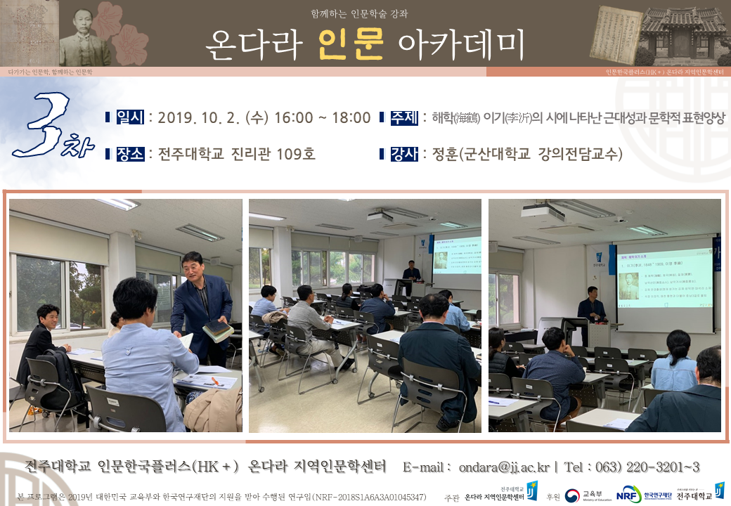 | 135 | 온다라 인문 아카데미 | 함께하는 인문학술강좌 『온다라 인문 아카데미』 2차 (2019. 9. 25.) | 온다라 지역인문학센터 | 19-09-27 | 836 |