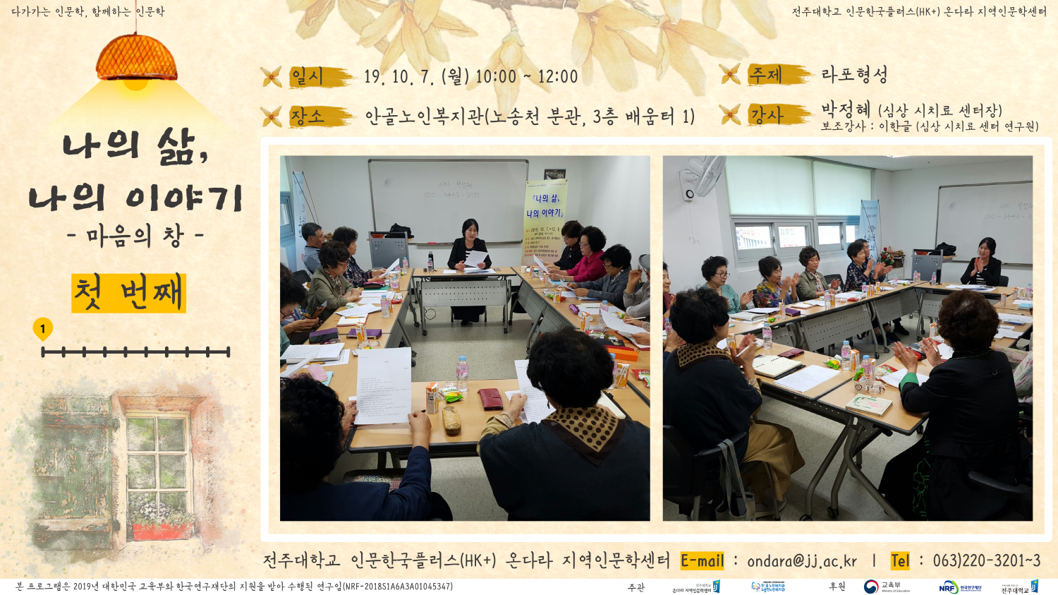 | 139 | 기타 | 마음의 창 『나의 삶, 나의 이야기』 1차 (2019. 10. 7.) | 온다라 지역인문학센터 | 19-10-14 | 889 |