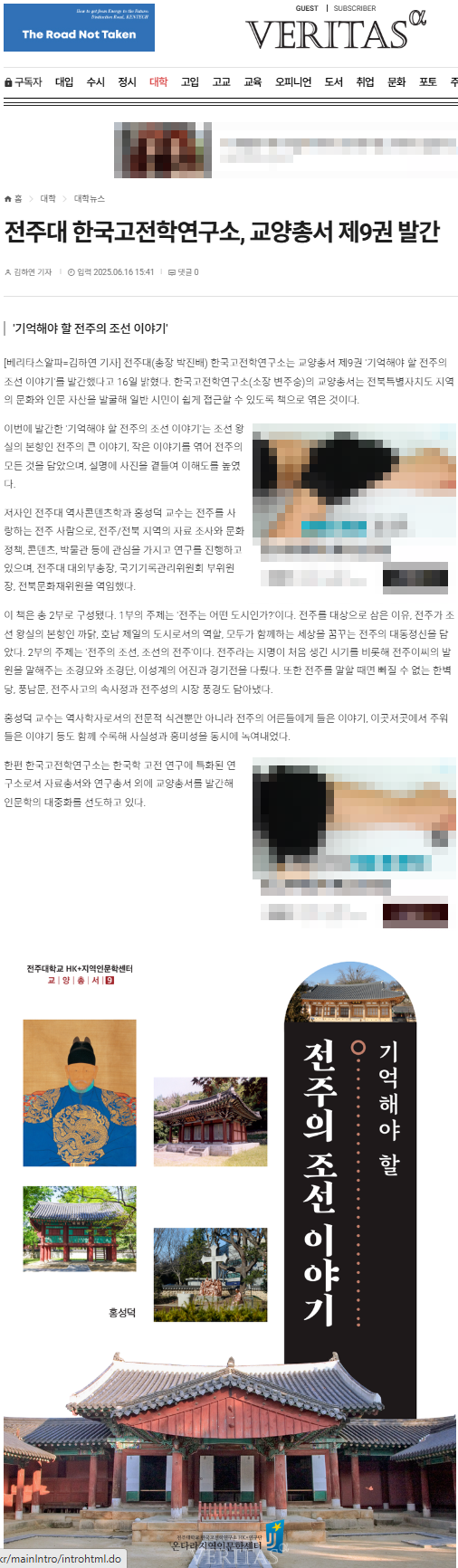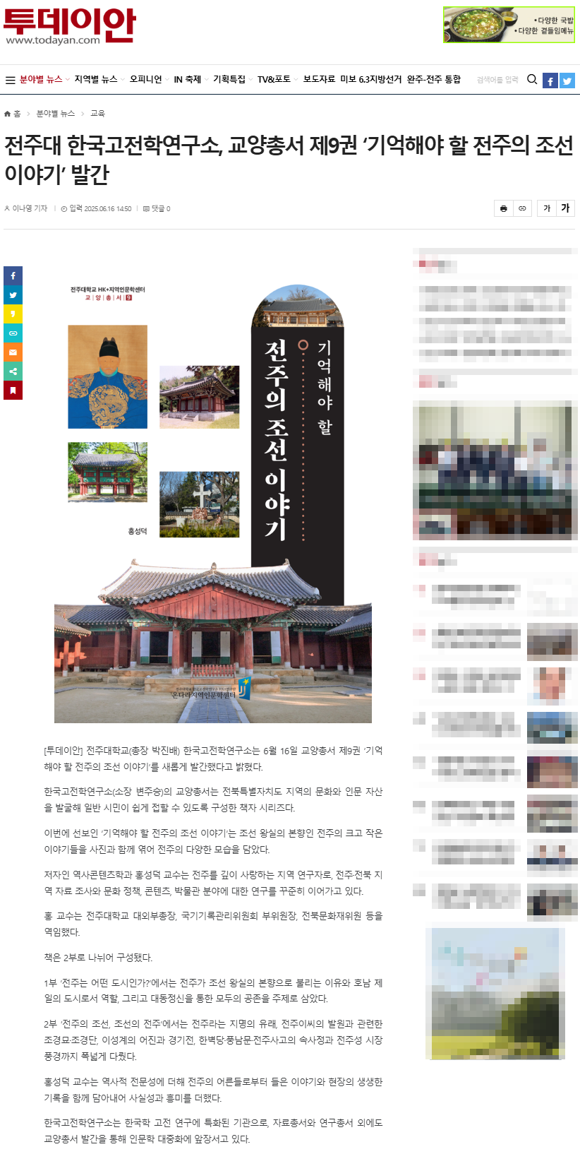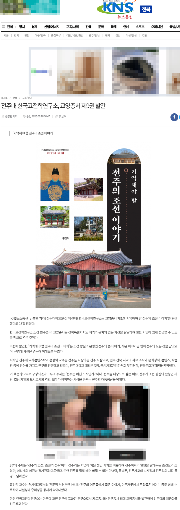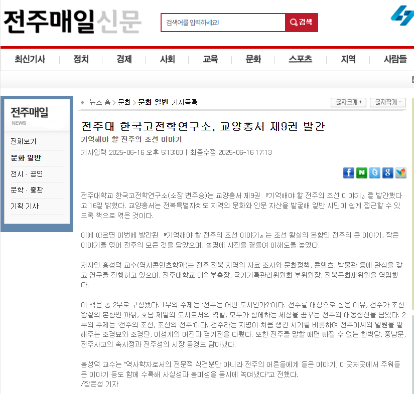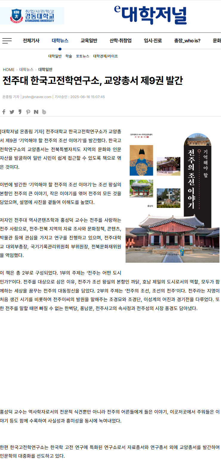 | [교양총서] 전주대 온다라 지역인문학센터, 교양총서 제9권 "기억해야 할 전주의 조선 이야기" 발간 |