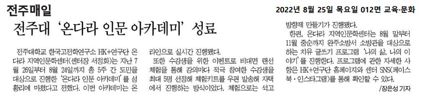 | 650 | 기타 | 전주대 '온다라 인문 아카데미' 성료 | 온다라 지역인문학센터 | 23-01-17 | 288 |