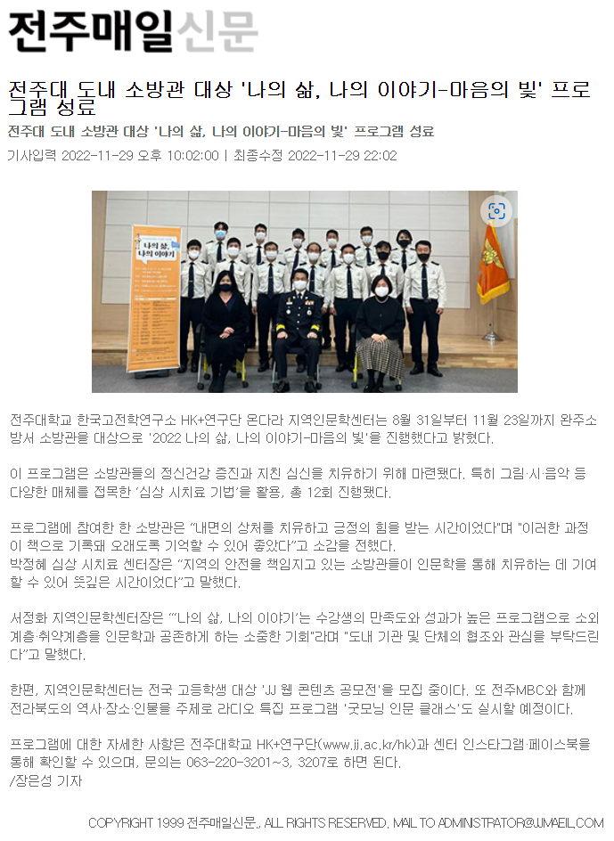 | 652 | 기타 | 전주대 도내 소방관 대상 '나의 삶, 나의 이야기-마음의 빛' 프로그램 성료 | 온다라 지역인문학센터 | 23-01-17 | 300 |