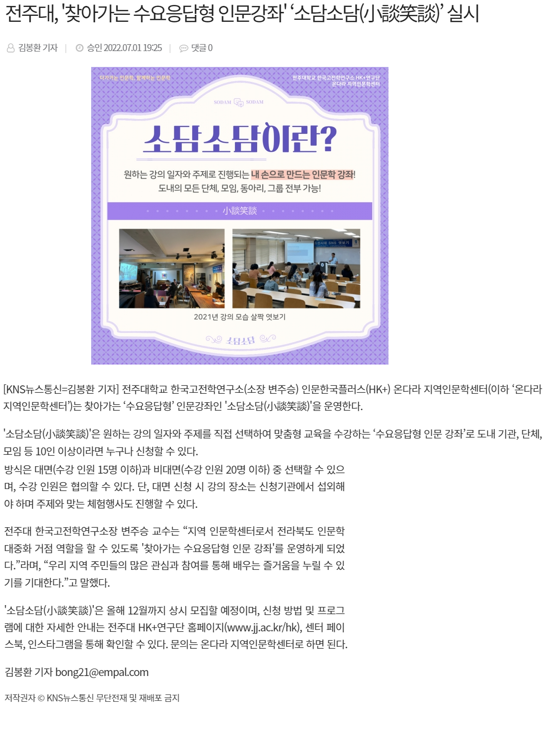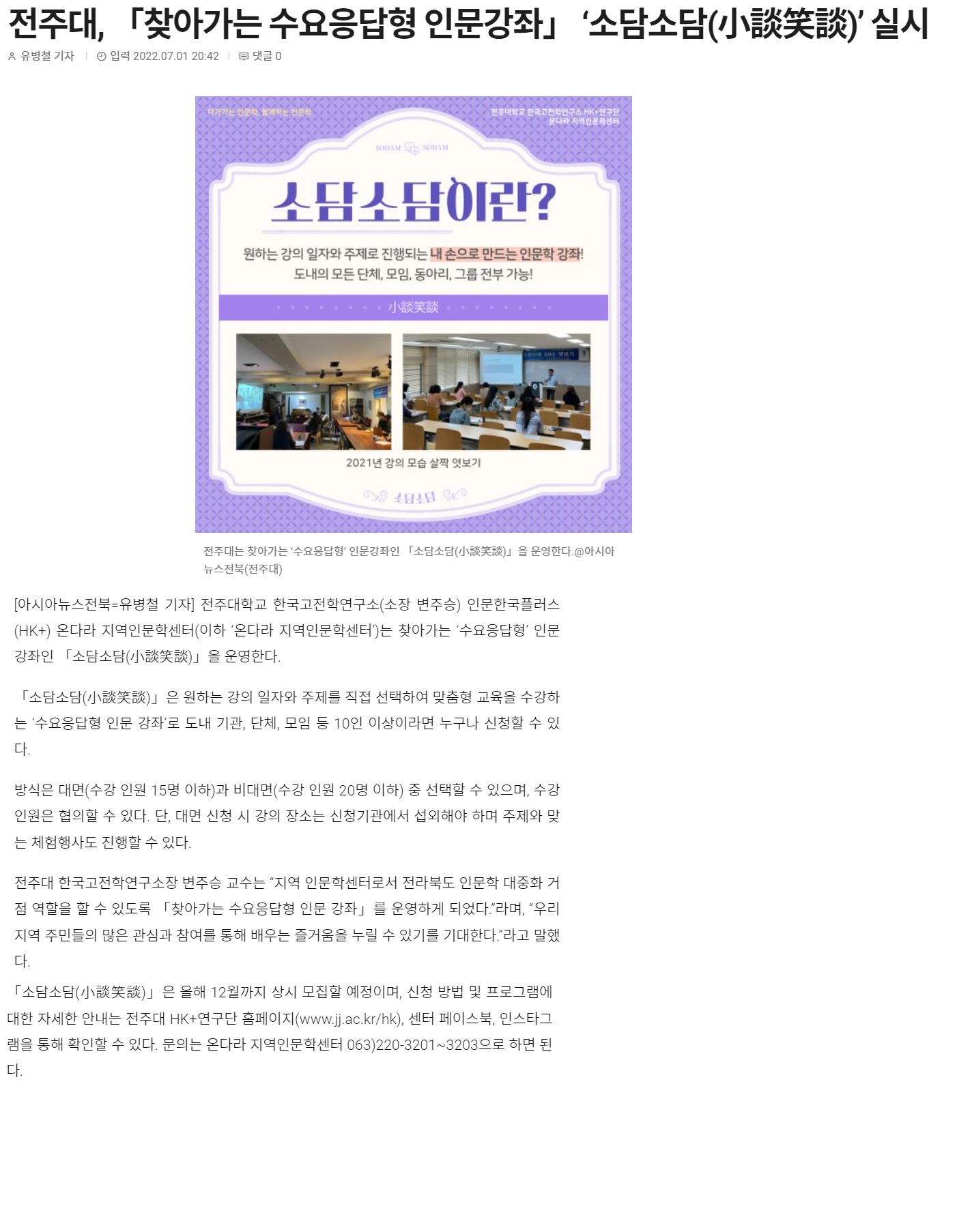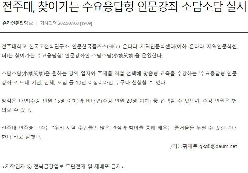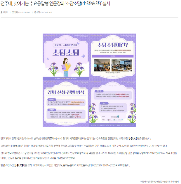 | 550 | 기타 | 전주대, '찾아가는 수요응답형 인문강좌' ‘소담소담(小談笑談)’ 실시 | 온다라 지역인문학센터 | 22-07-04 | 216 |