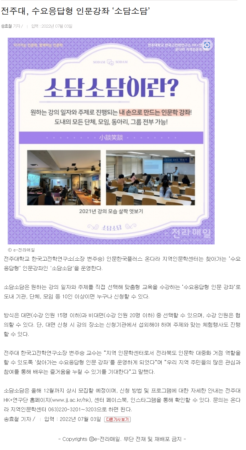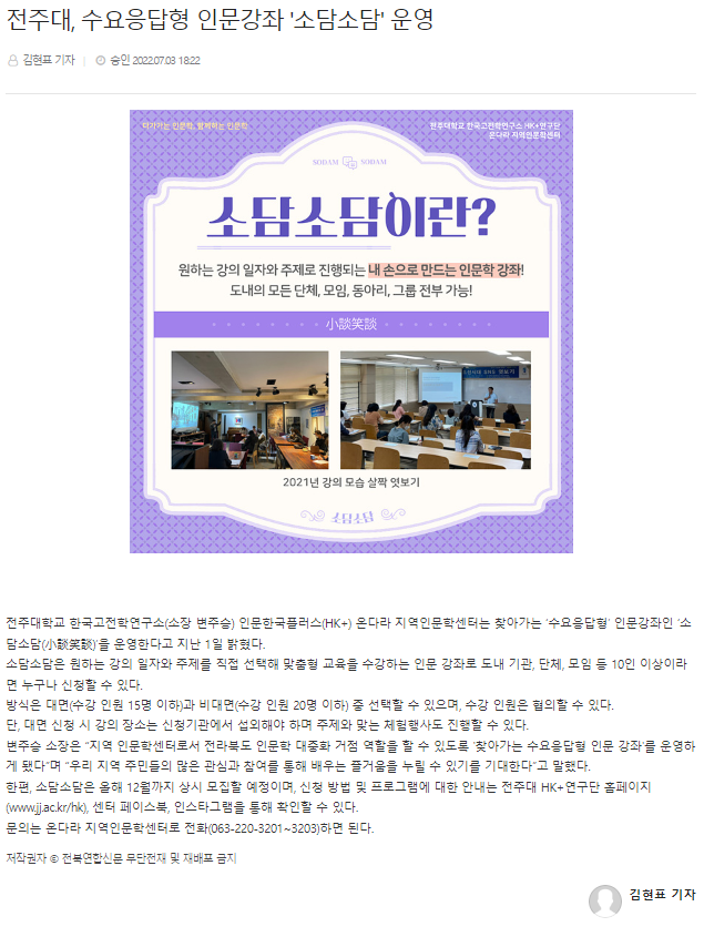 | 554 | 기타 | 전주대, 수요응답형 인문강좌 '소담소담' 운영 | 온다라 지역인문학센터 | 22-07-04 | 217 |