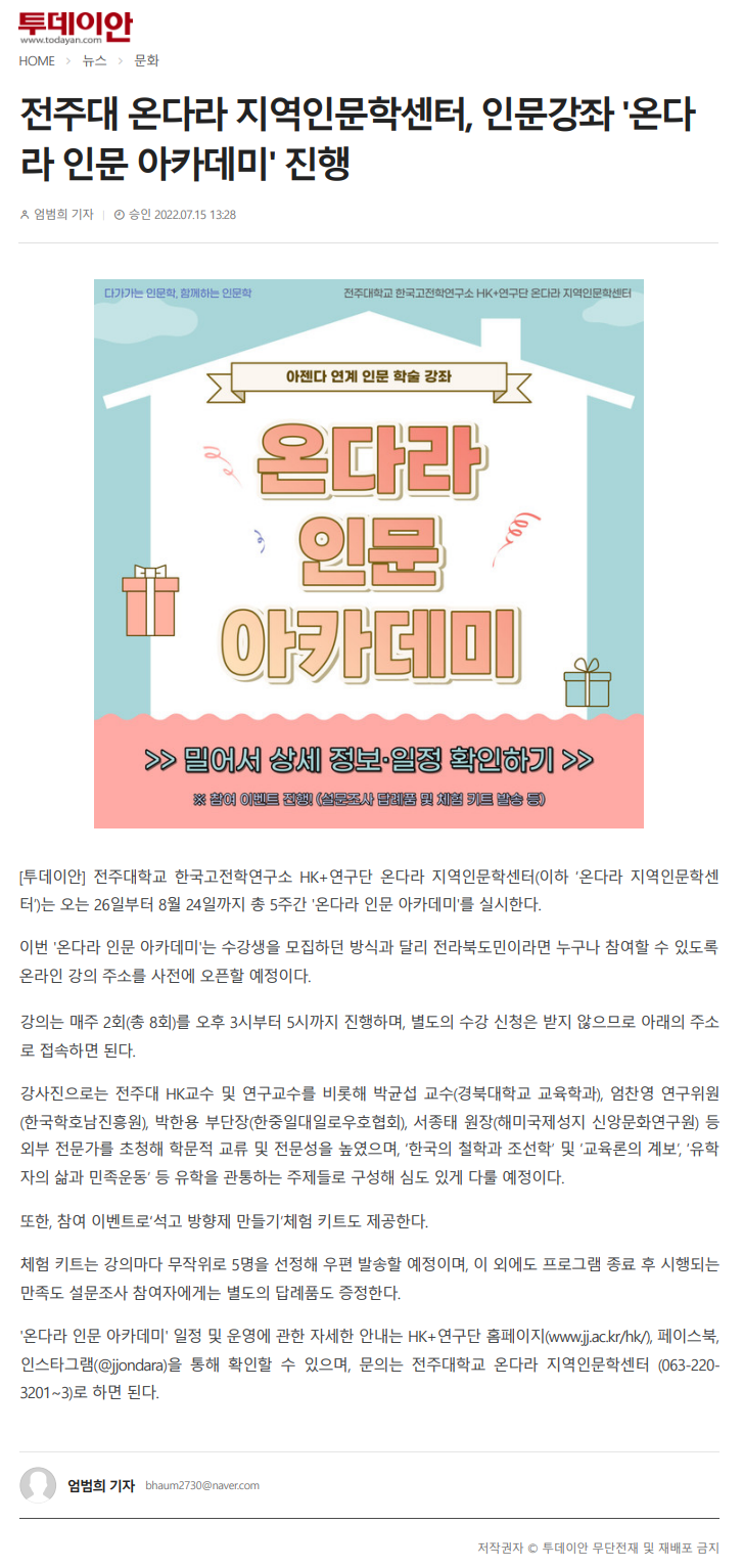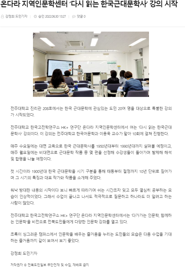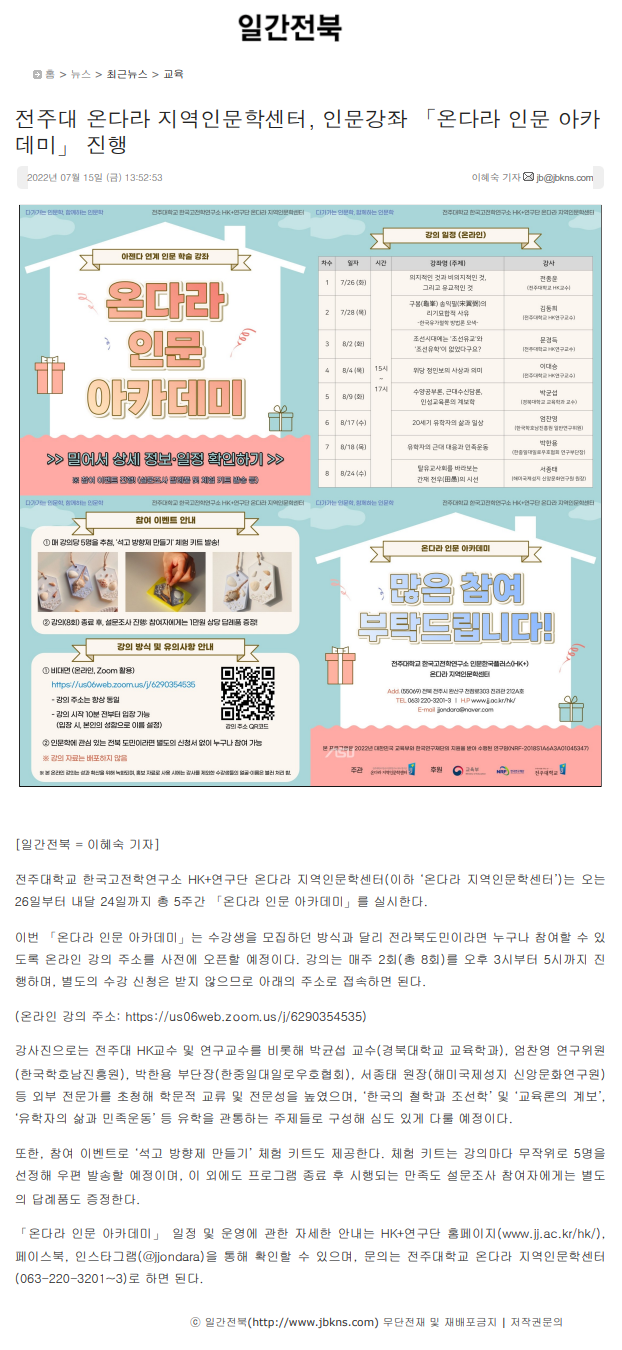 | 558 | 기타 | 전주대 온다라 지역인문학센터, 인문강좌 「온다라 인문 아카데미」 진행 | 온다라 지역인문학센터 | 22-07-19 | 220 |