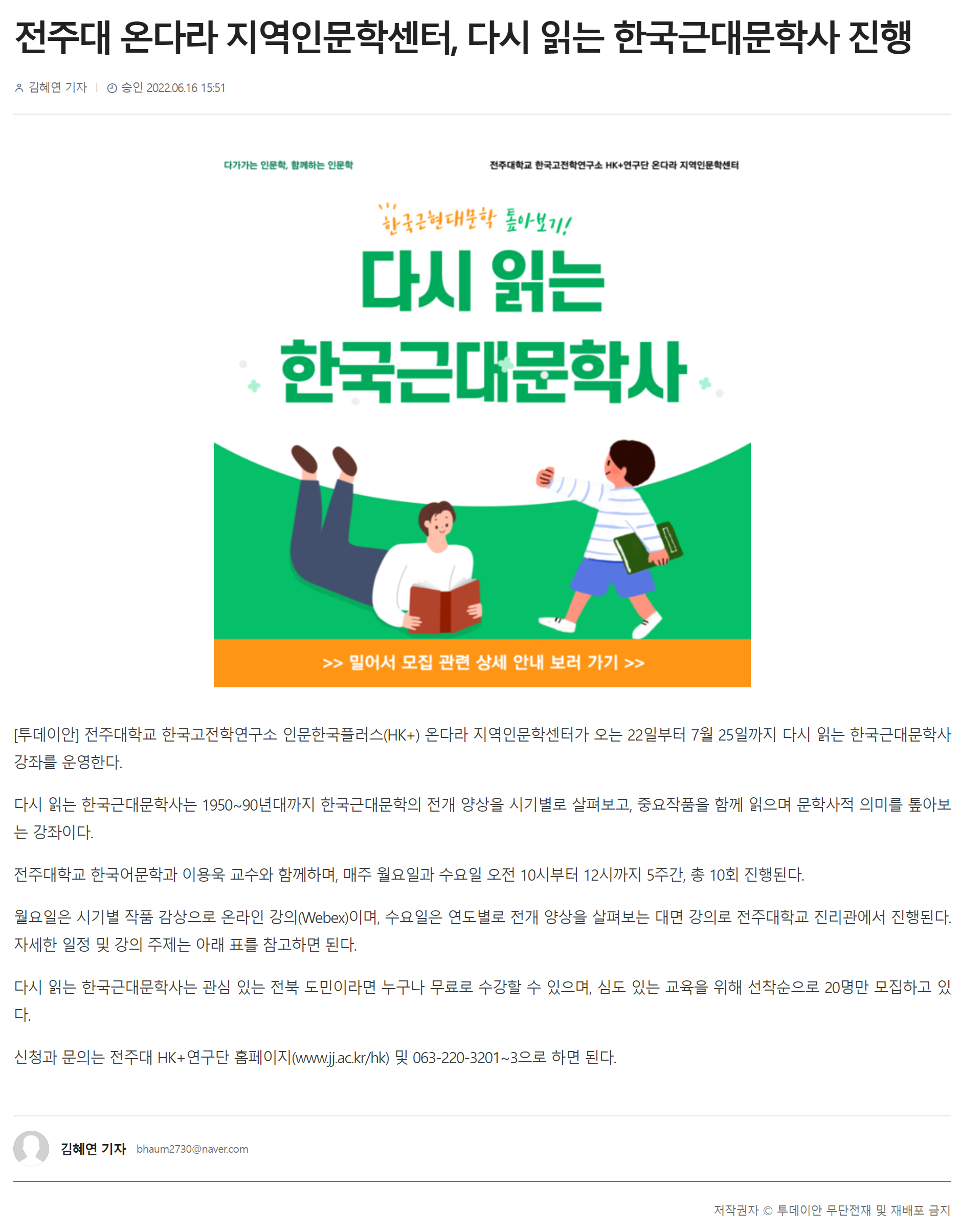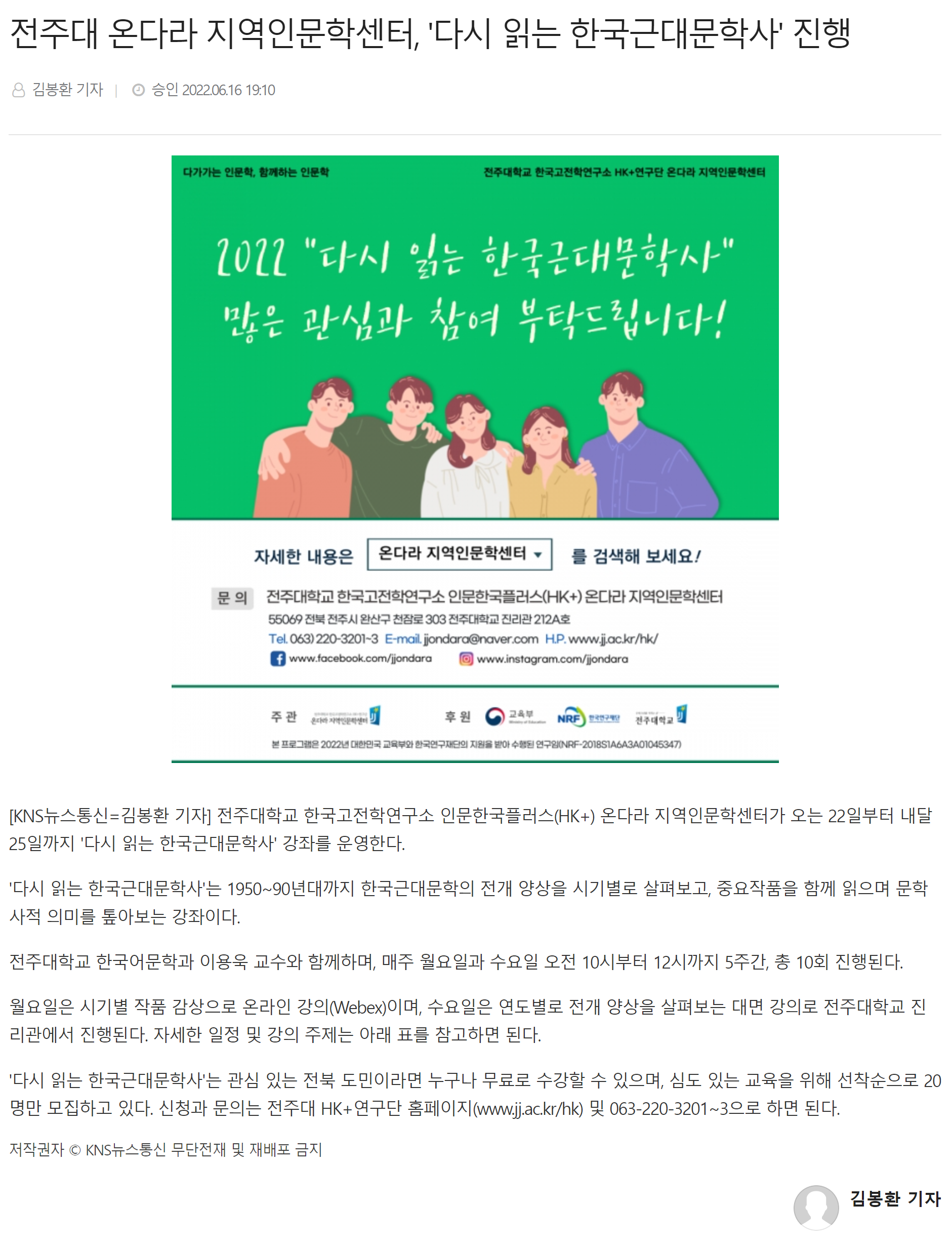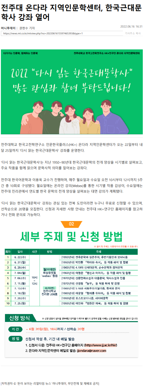 | 541 | 기타 | 전주대 온다라 지역인문학센터, 한국근대문학사 강좌 열어 | 온다라 지역인문학센터 | 22-06-30 | 190 |