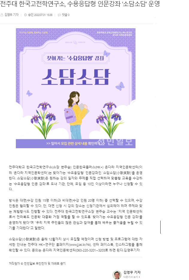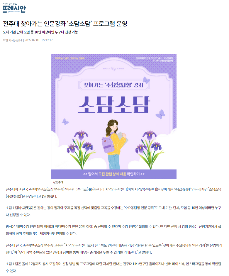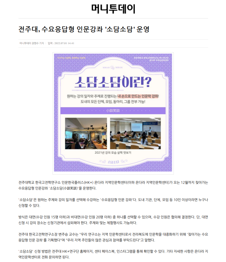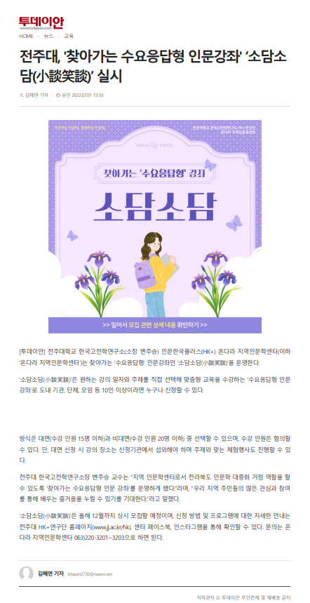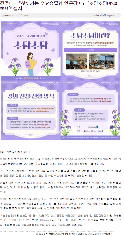 | 547 | 기타 | 전주대학교, 찾아가는 수요응답형 인문강좌 ‘소담소담' 운영 | 온다라 지역인문학센터 | 22-07-04 | 195 |