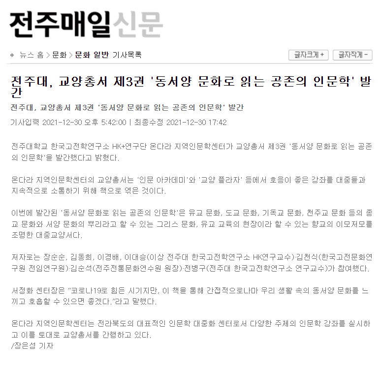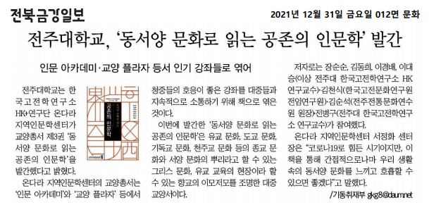 | 500 | 기타 | 전주대, 교양총서 제3권 '동서양 문화로 읽는 공존의 인문학' 발간 | 온다라 지역인문학센터 | 22-02-07 | 200 |