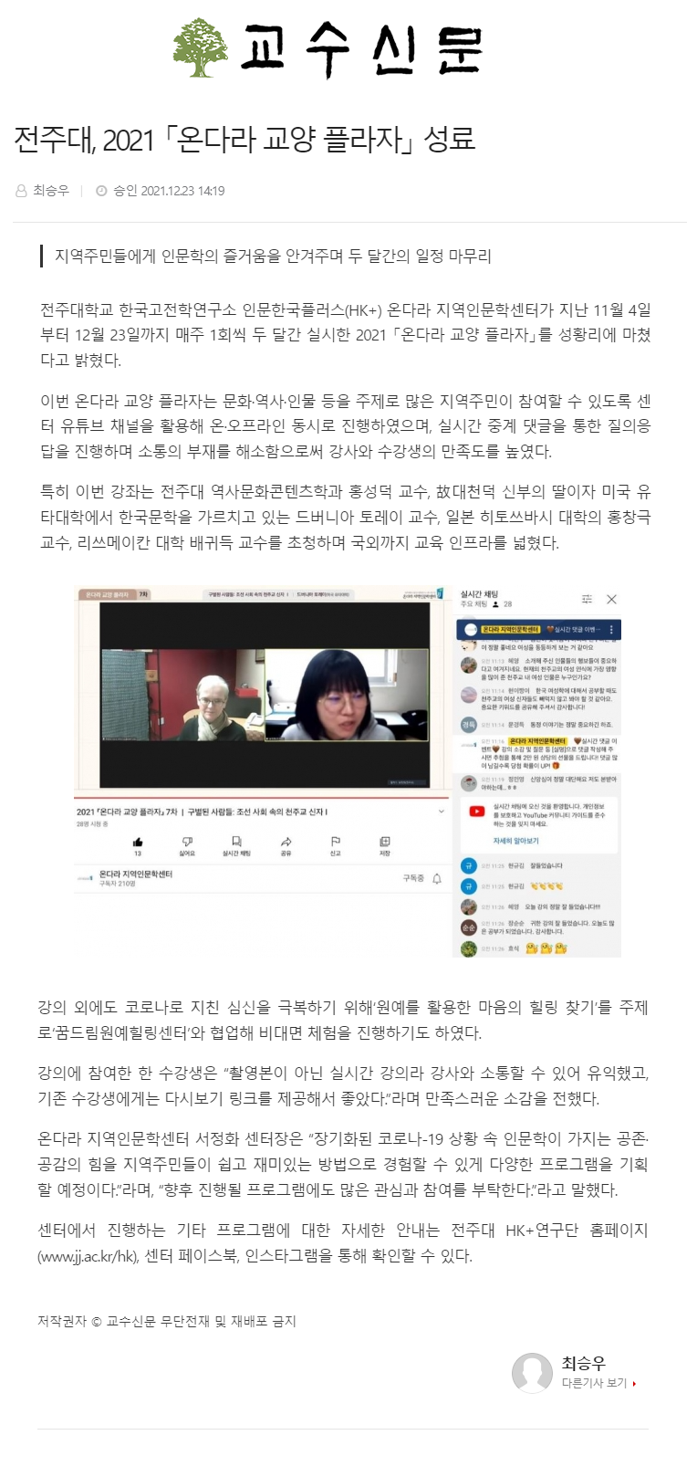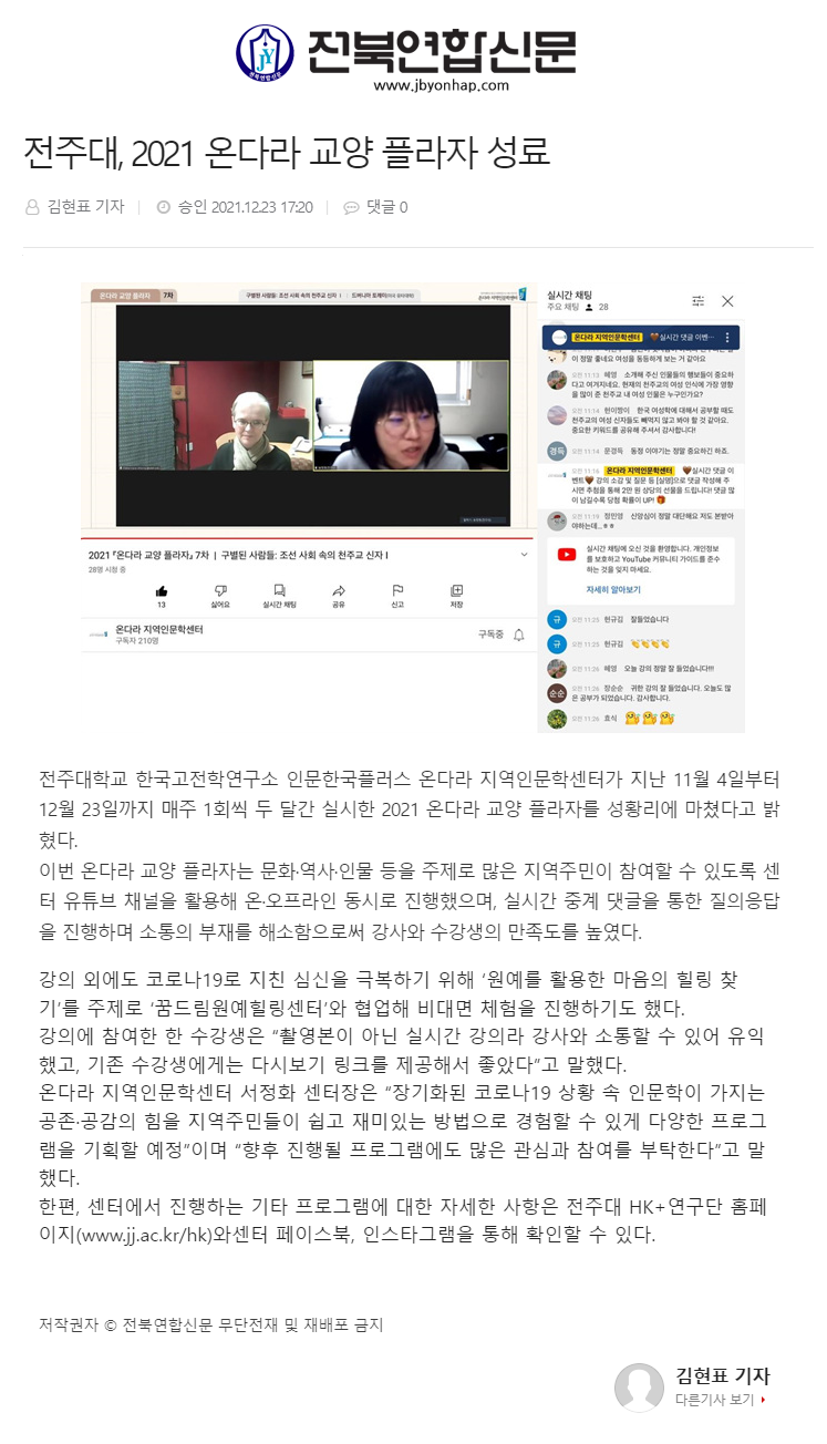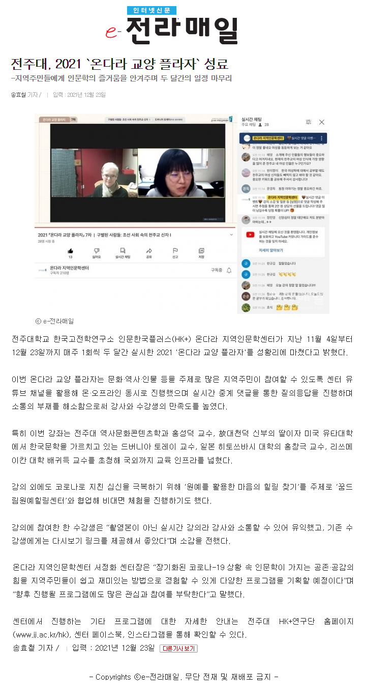 | 503 | 기타 | 전주대, 2021 `온다라 교양 플라자` 성료 | 온다라 지역인문학센터 | 22-02-07 | 184 |