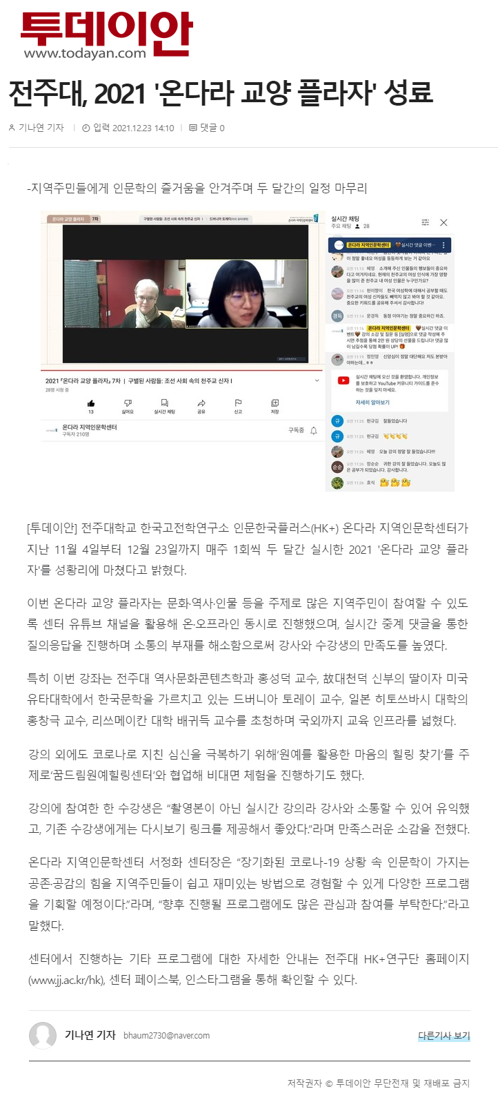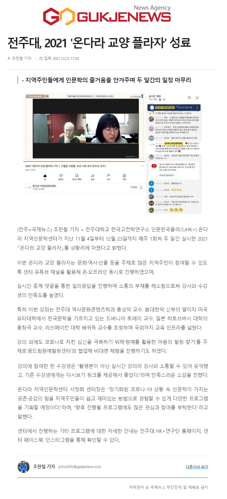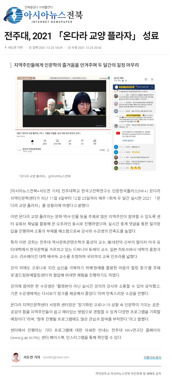 | 503 | 기타 | 전주대, 2021 `온다라 교양 플라자` 성료 | 온다라 지역인문학센터 | 22-02-07 | 184 |