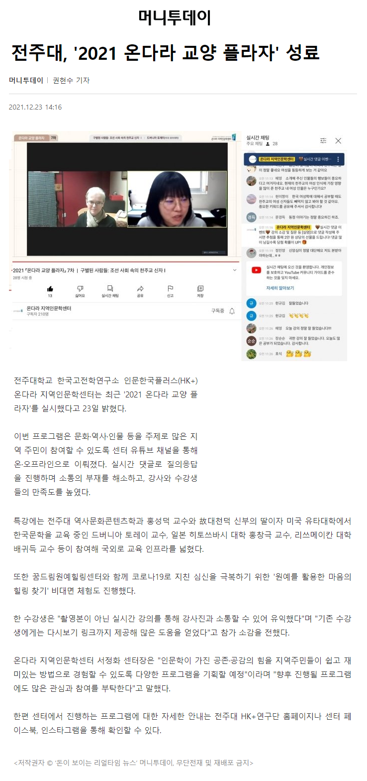 | 504 | 기타 | 전주대, 2021 「온다라 교양 플라자」 성료 | 온다라 지역인문학센터 | 22-02-07 | 188 |