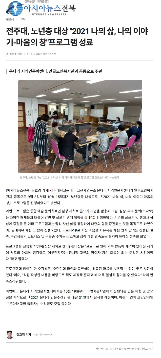 | 490 | 기타 | 전주대, 노년층 대상 "2021 나의 삶, 나의 이야기-마음의 창"프로그램 성료 | 온다라 지역인문학센터 | 22-01-25 | 207 |