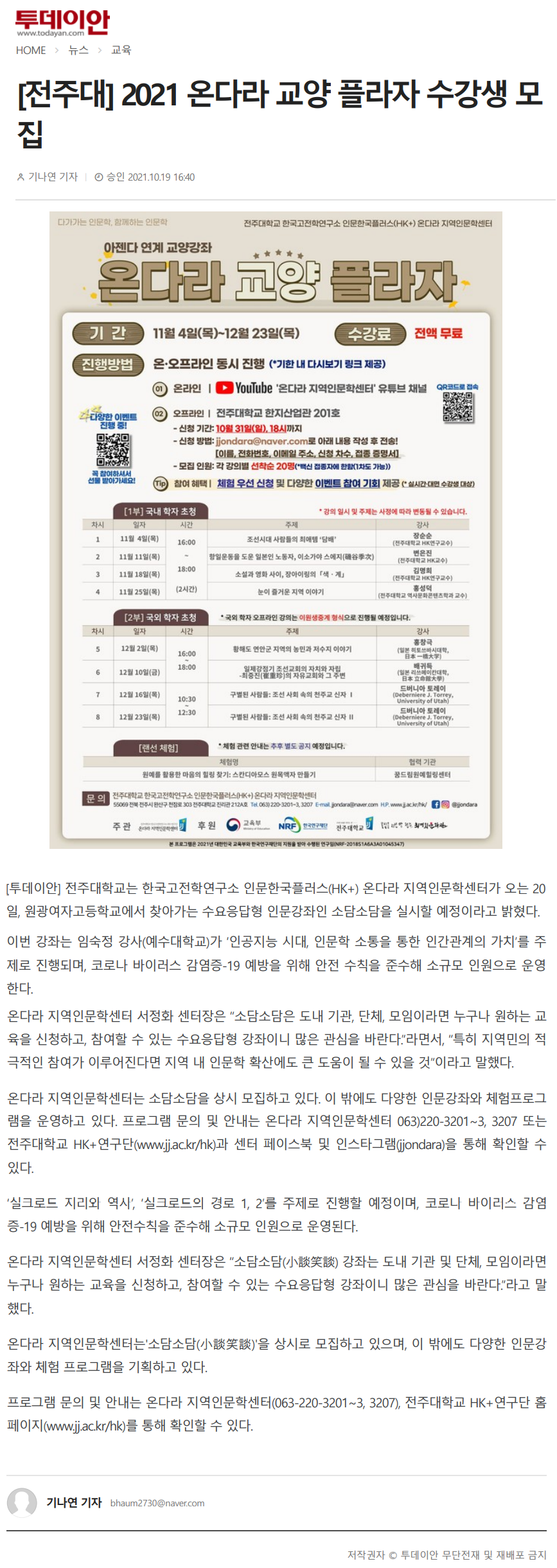 [전주대] 2021 온다라 교양 플라자 수강생 모집