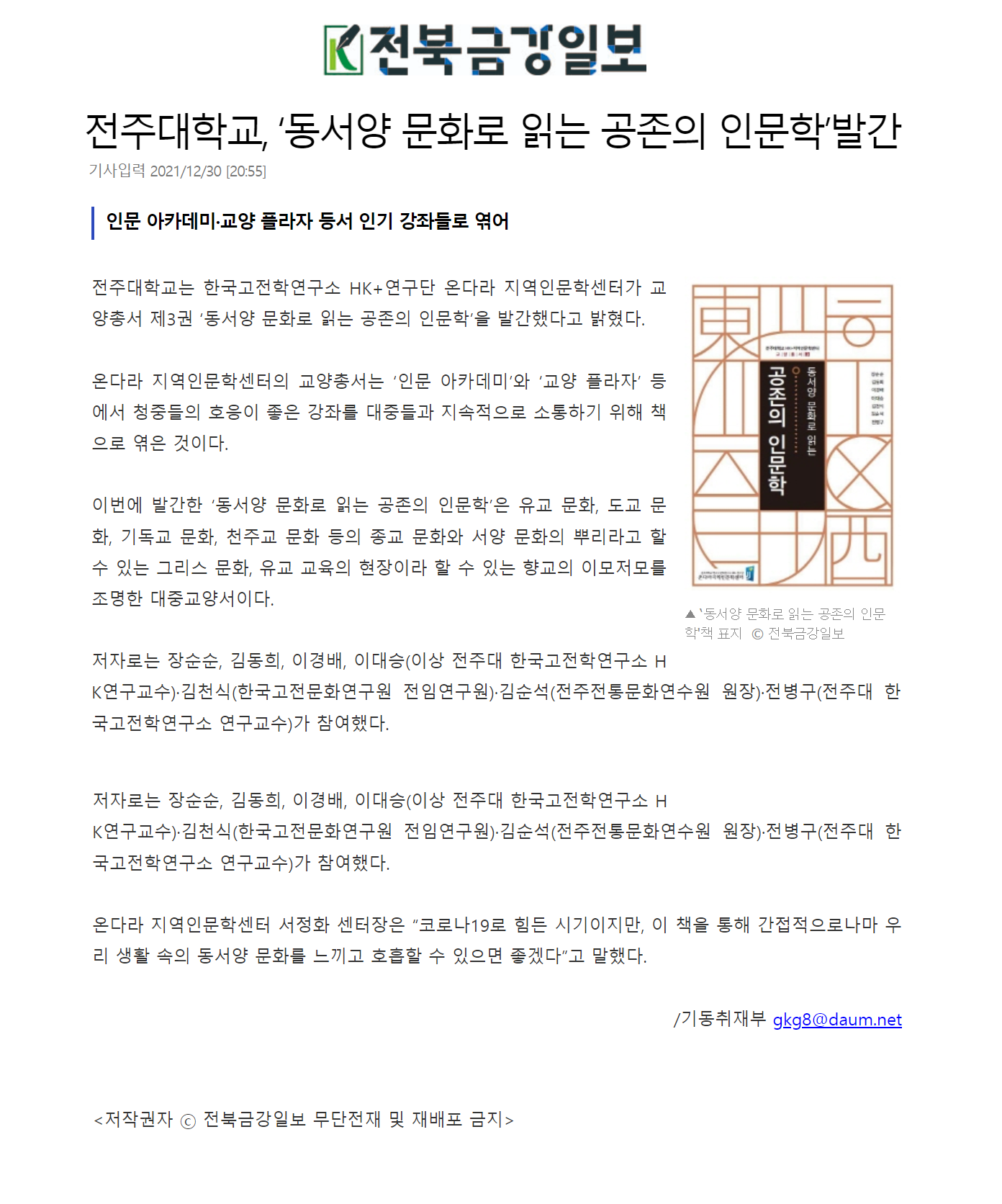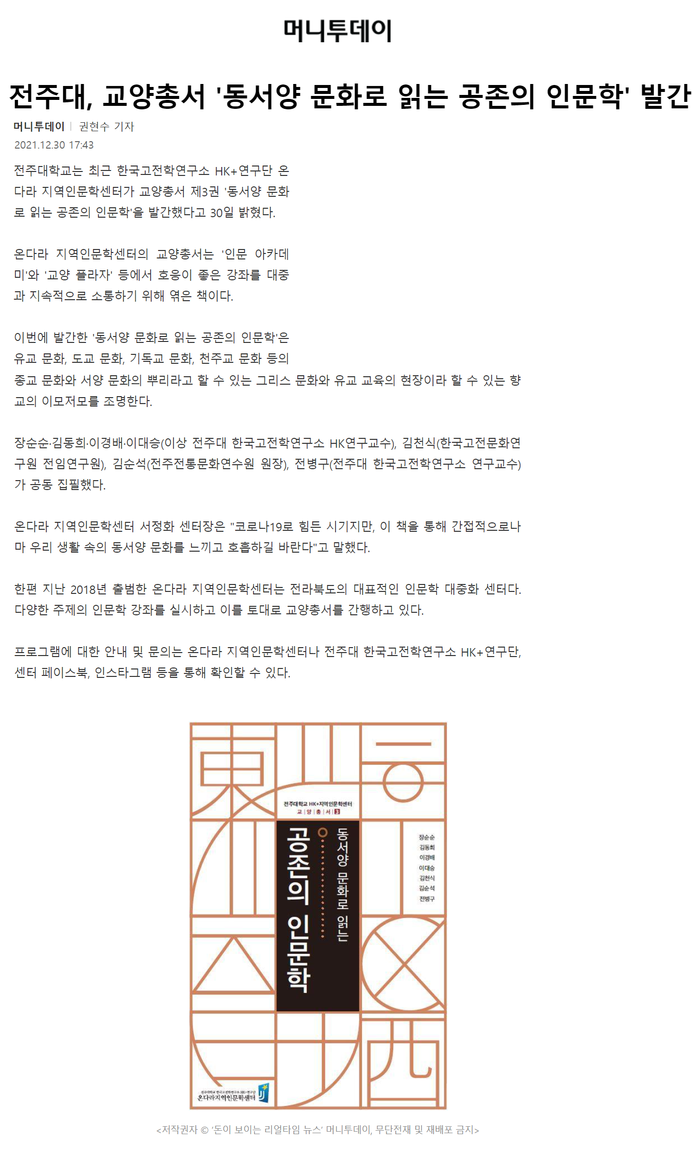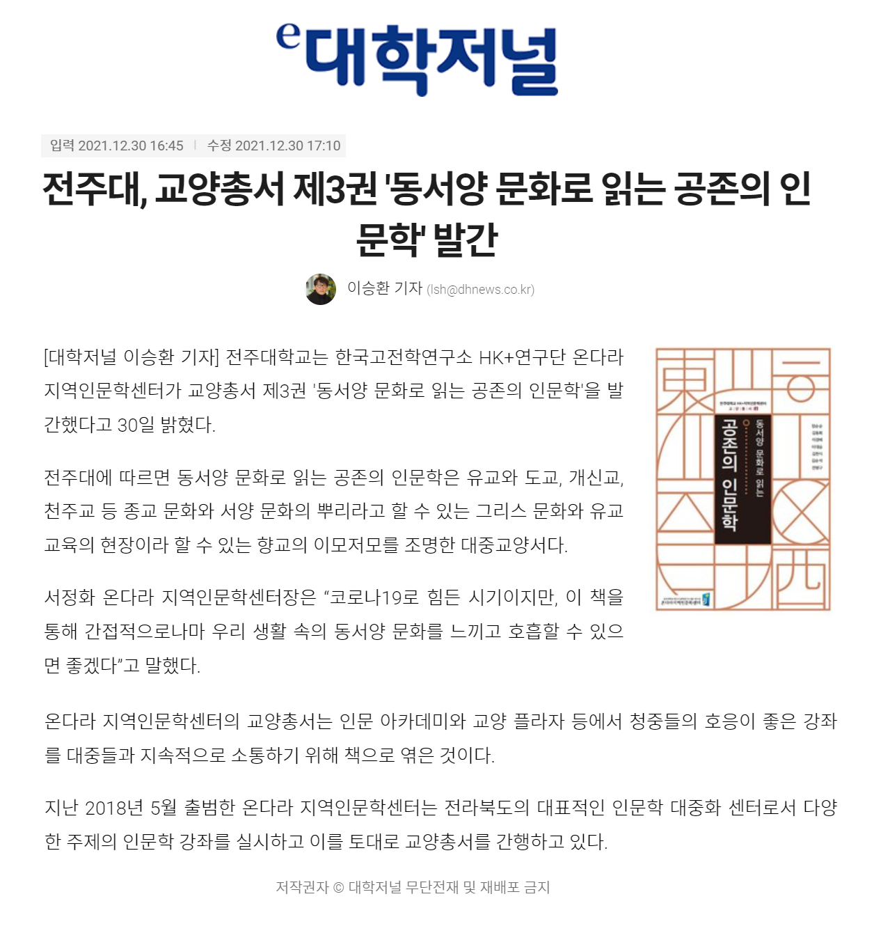 | 496 | 기타 | 전주대학교, ‘동서양 문화로 읽는 공존의 인문학’발간 | 온다라 지역인문학센터 | 22-01-28 | 205 |