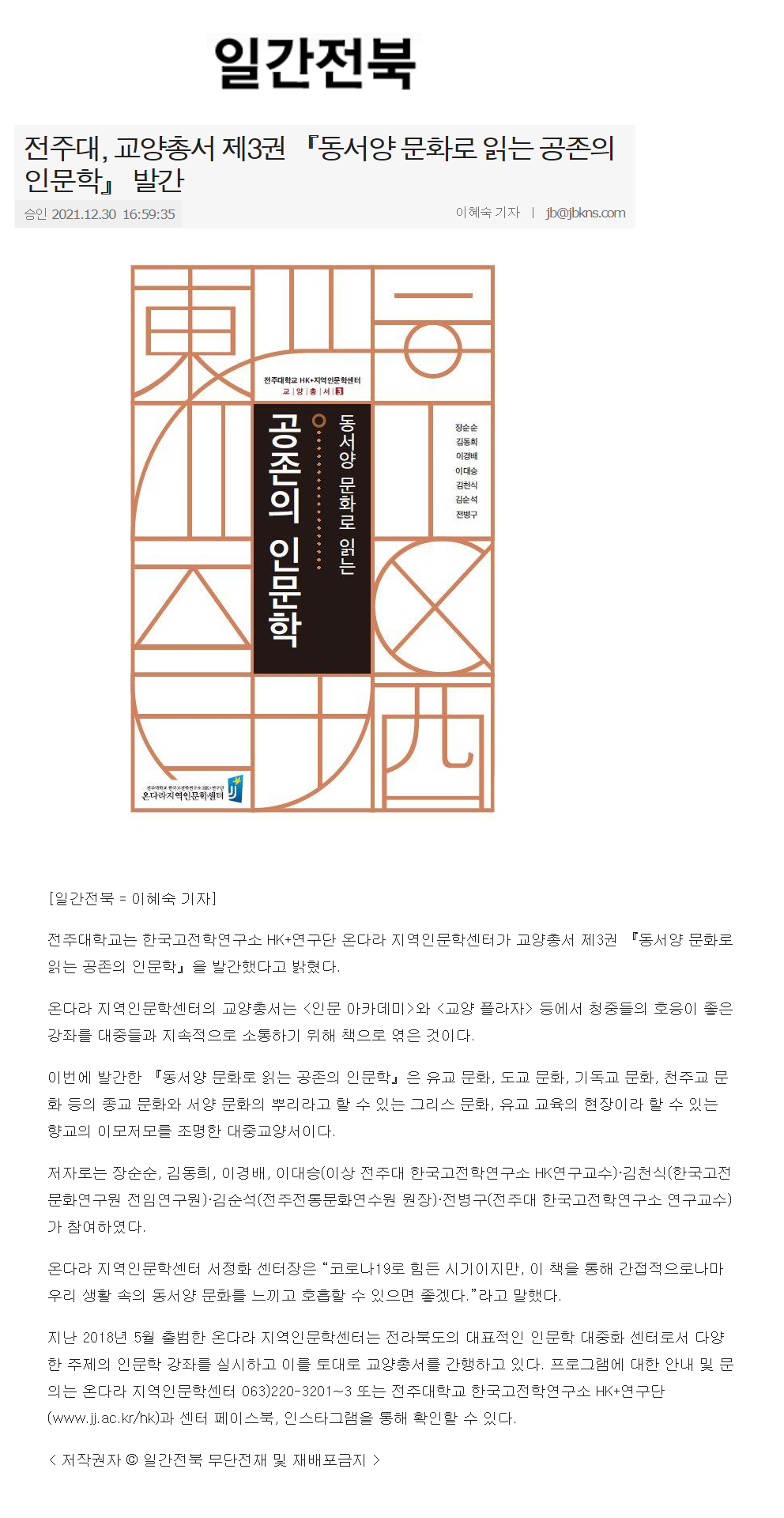 | 495 | 기타 | 전주대, 교양총서 제3권 '동서양 문화로 읽는 공존의 인문학' 발간 | 온다라 지역인문학센터 | 22-01-28 | 226 |