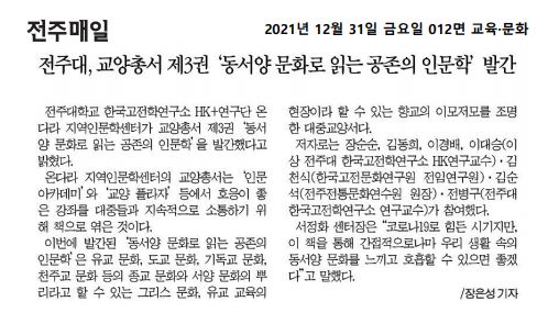 | 493 | 기타 | 전주대, 교양총서 '동서양 문화로 읽는 공존의 인문학' 발간 | 온다라 지역인문학센터 | 22-01-28 | 214 |