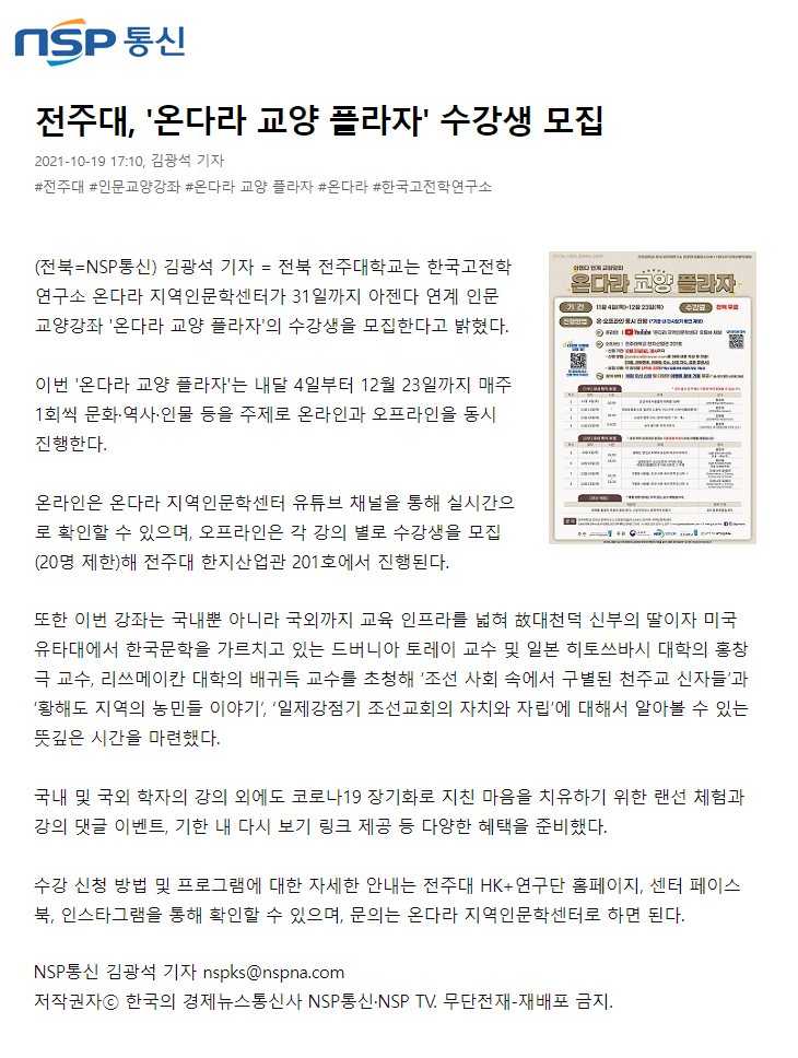 | 463 | 기타 | 전주대, 인문 교양강좌 온다라 교양 플라자 수강생 모집 | 온다라 지역인문학센터 | 21-10-20 | 232 |