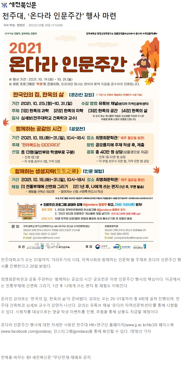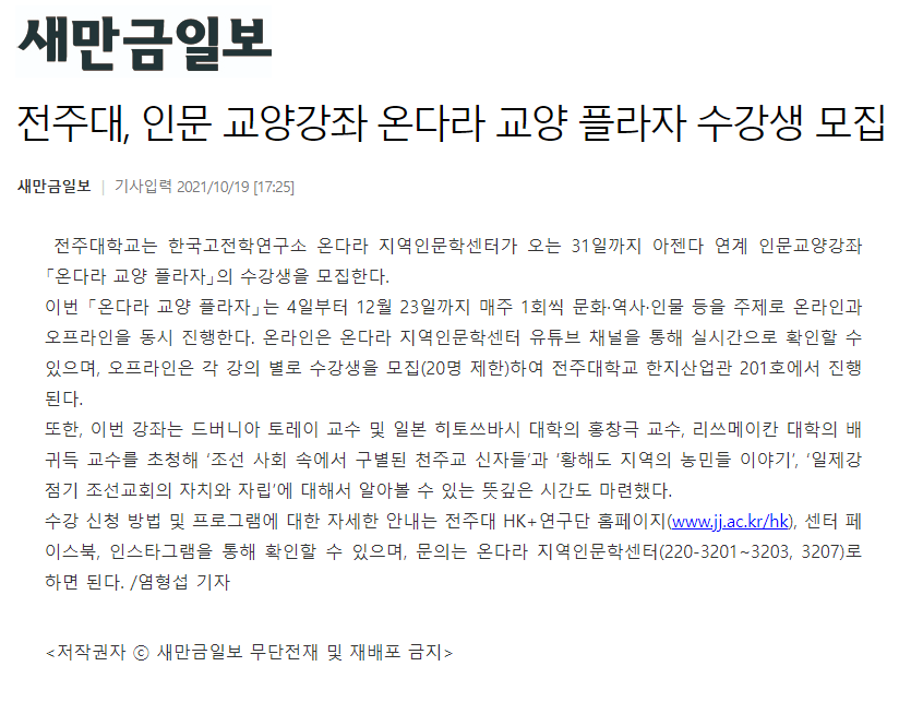 | 461 | 기타 | 전주대, 인문 교양강좌 「온다라 교양 플라자」수강생 모집 | 온다라 지역인문학센터 | 21-10-20 | 213 |
