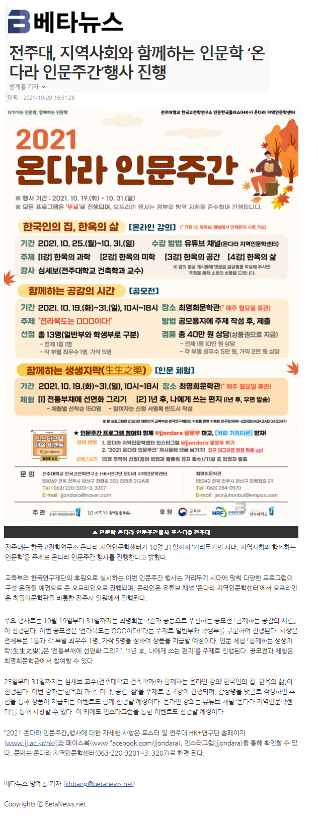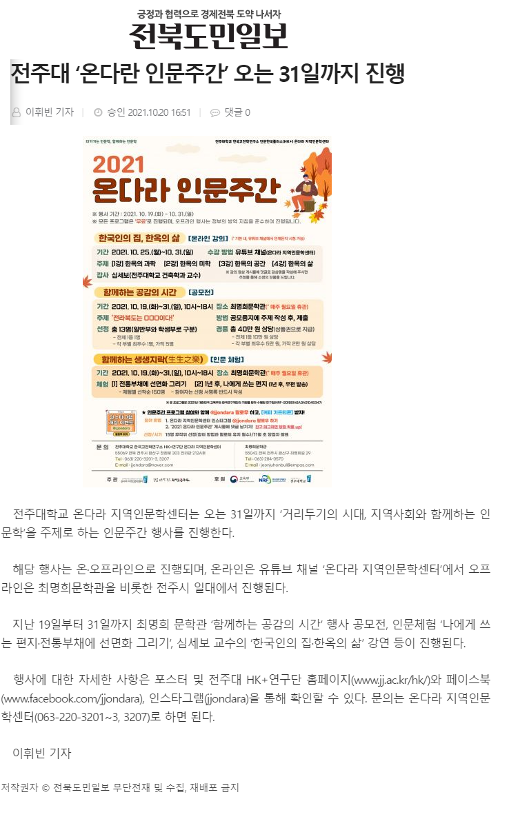 | 462 | 기타 | 전주대, 인문 교양강좌 <온다라 교양 플라자> 수강생 모집 | 온다라 지역인문학센터 | 21-10-20 | 218 |