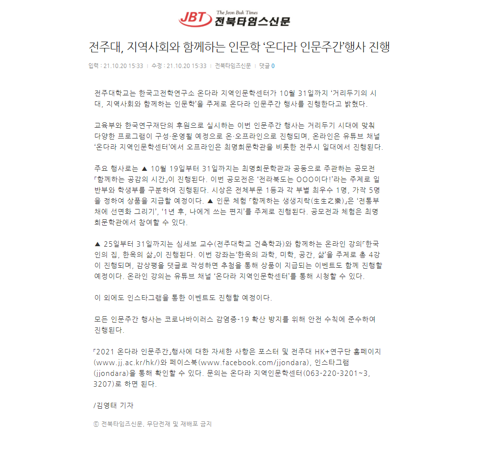 | 467 | 기타 | 전주대, 지역사회와 함께하는 인문학 '온다라 인문주간' 행사 진행 | 온다라 지역인문학센터 | 21-10-25 | 229 |