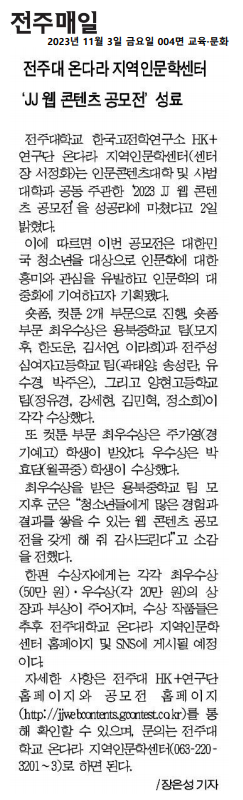 | 719 | 기타 | 전주대 온다라 지역인문학센터 'JJ 웹 콘텐츠 공모전' 성료 | 온다라 지역인문학센터 | 23-11-14 | 208 |