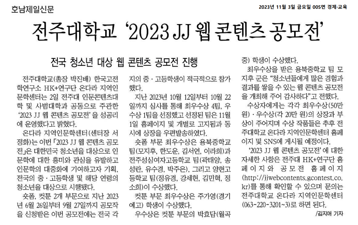 전주대 온다라 지역인문학센터 'JJ 웹 콘텐츠 공모전' 성료