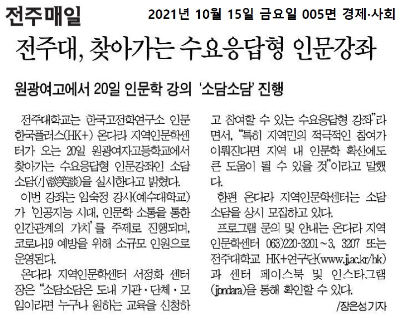 | 449 | 기타 | 전주대, 찾아가는 수요응답형 인문강좌 | 온다라 지역인문학센터 | 21-10-20 | 203 |