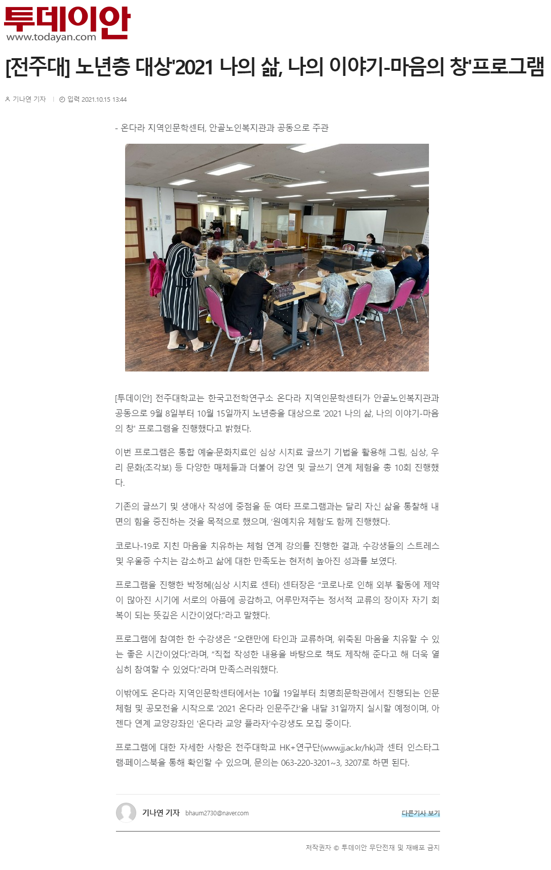 | 453 | 기타 | 전주대, 노년층 대상「2021 나의 삶, 나의 이야기-마음의 창」프로그램 성료 | 온다라 지역인문학센터 | 21-10-20 | 214 |