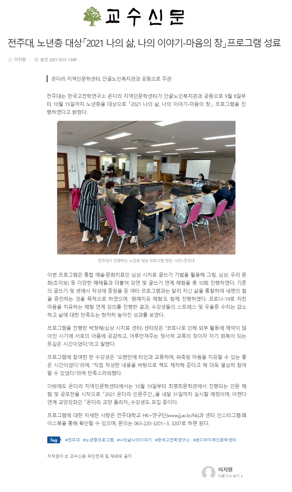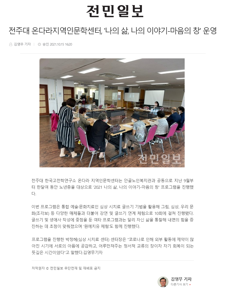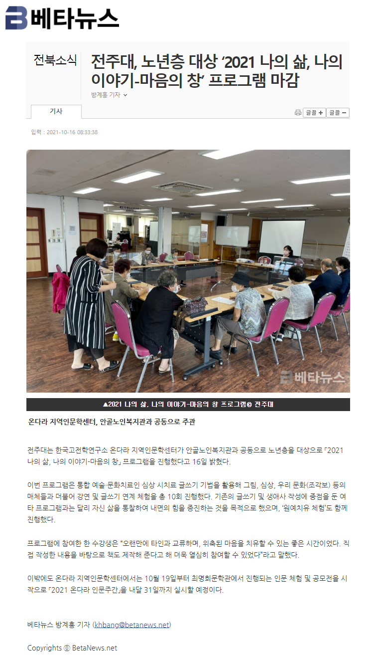 | 454 | 기타 | 전주대, 노년층 대상「2021 나의 삶, 나의 이야기-마음의 창」프로그램 성료 | 온다라 지역인문학센터 | 21-10-20 | 207 |