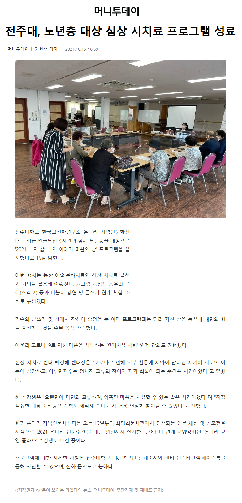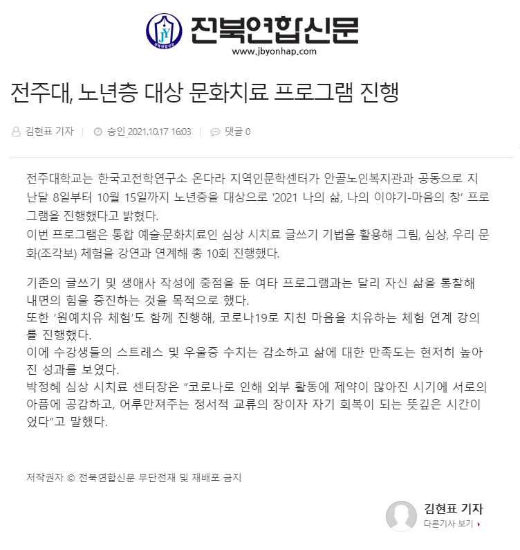 | 452 | 기타 | 전주대, 노년층 대상 심상 시치료 프로그램 성료 | 온다라 지역인문학센터 | 21-10-20 | 208 |