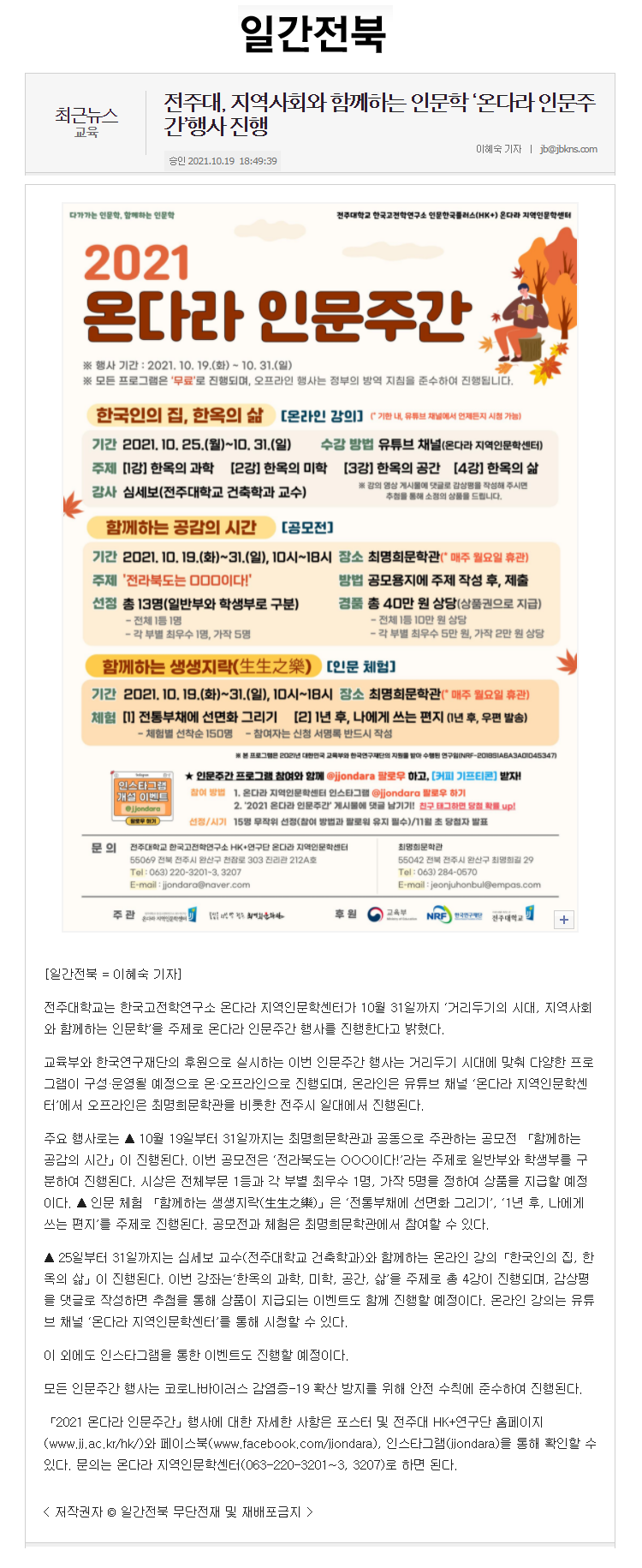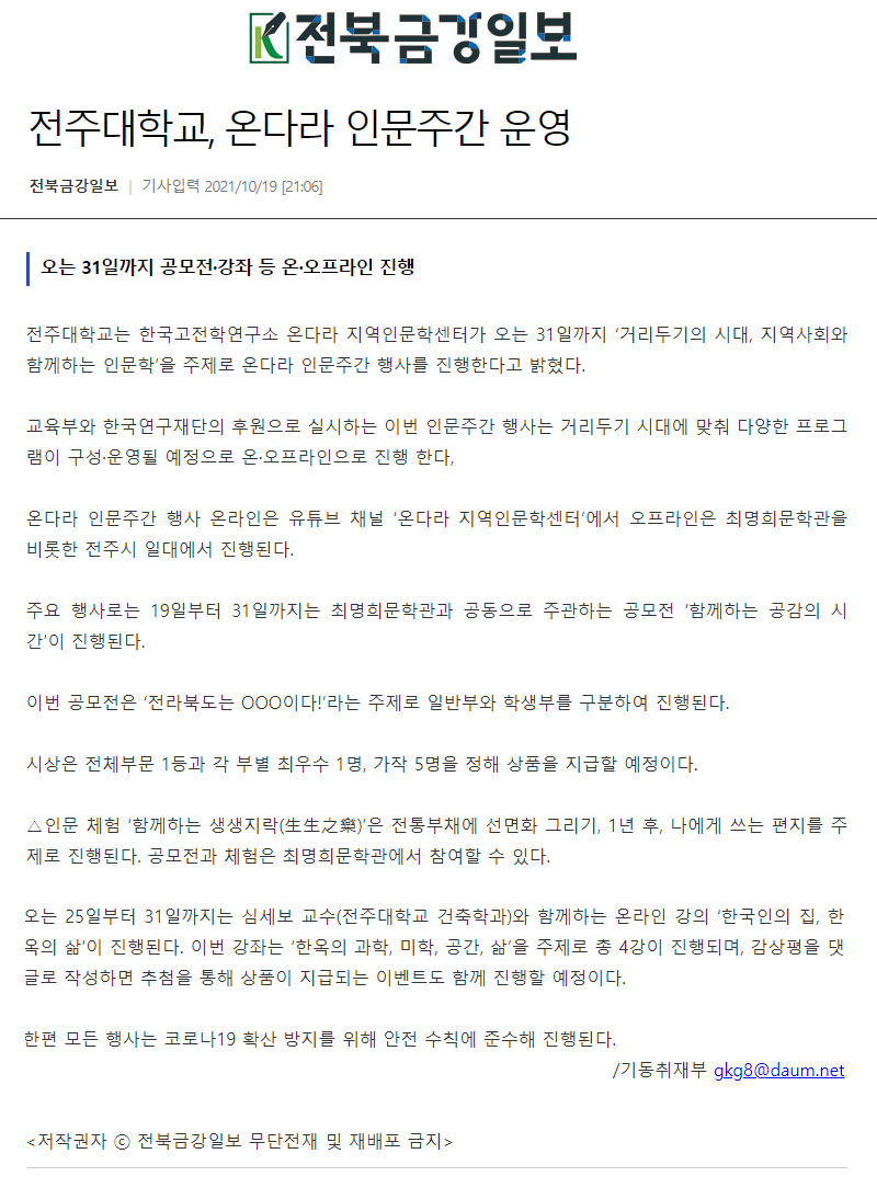 | 457 | 기타 | 전주대, 지역사회와 함께하는 인문학 ‘온다라 인문주간’행사 진행 | 온다라 지역인문학센터 | 21-10-20 | 208 |