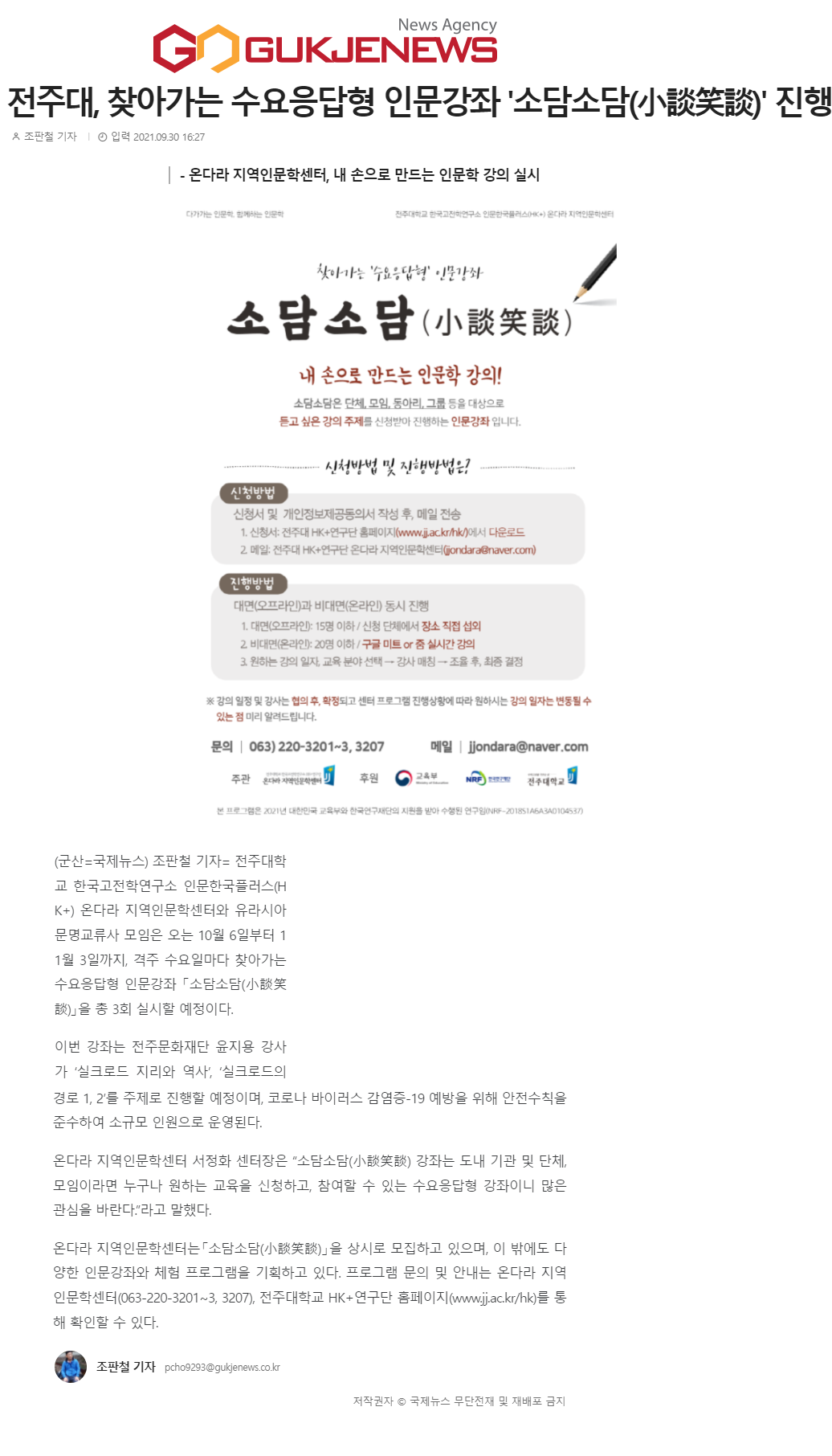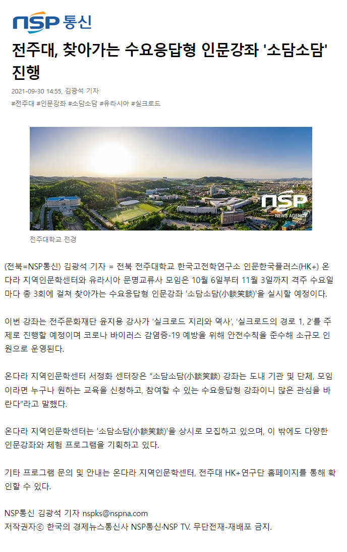 | 434 | 기타 | 전주대 온다라 지역인문학센터, 수요응답형 인문강좌 '소담소담' 진행 | 온다라 지역인문학센터 | 21-10-05 | 219 |