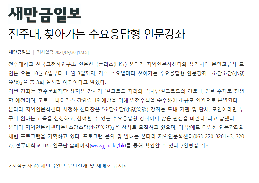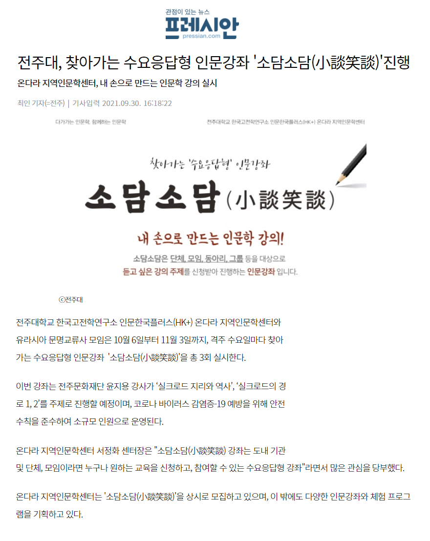 | 431 | 기타 | 전주대, 찾아가는 수요응답형 인문강좌 `소담소담(小談笑談)`진행 | 온다라 지역인문학센터 | 21-10-05 | 194 |