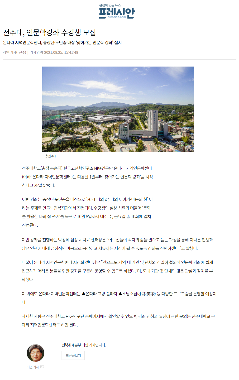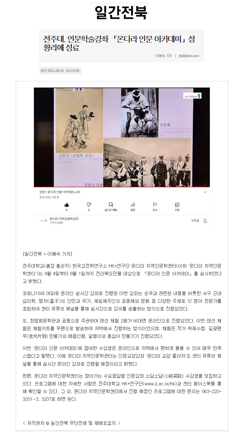 | 412 | 기타 | 전주대, 인문학술강좌 '온다라 인문 아카데미' 성료 | 온다라 지역인문학센터 | 21-09-08 | 208 |