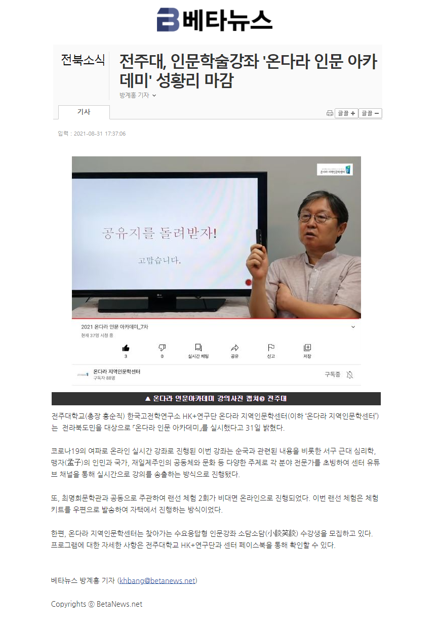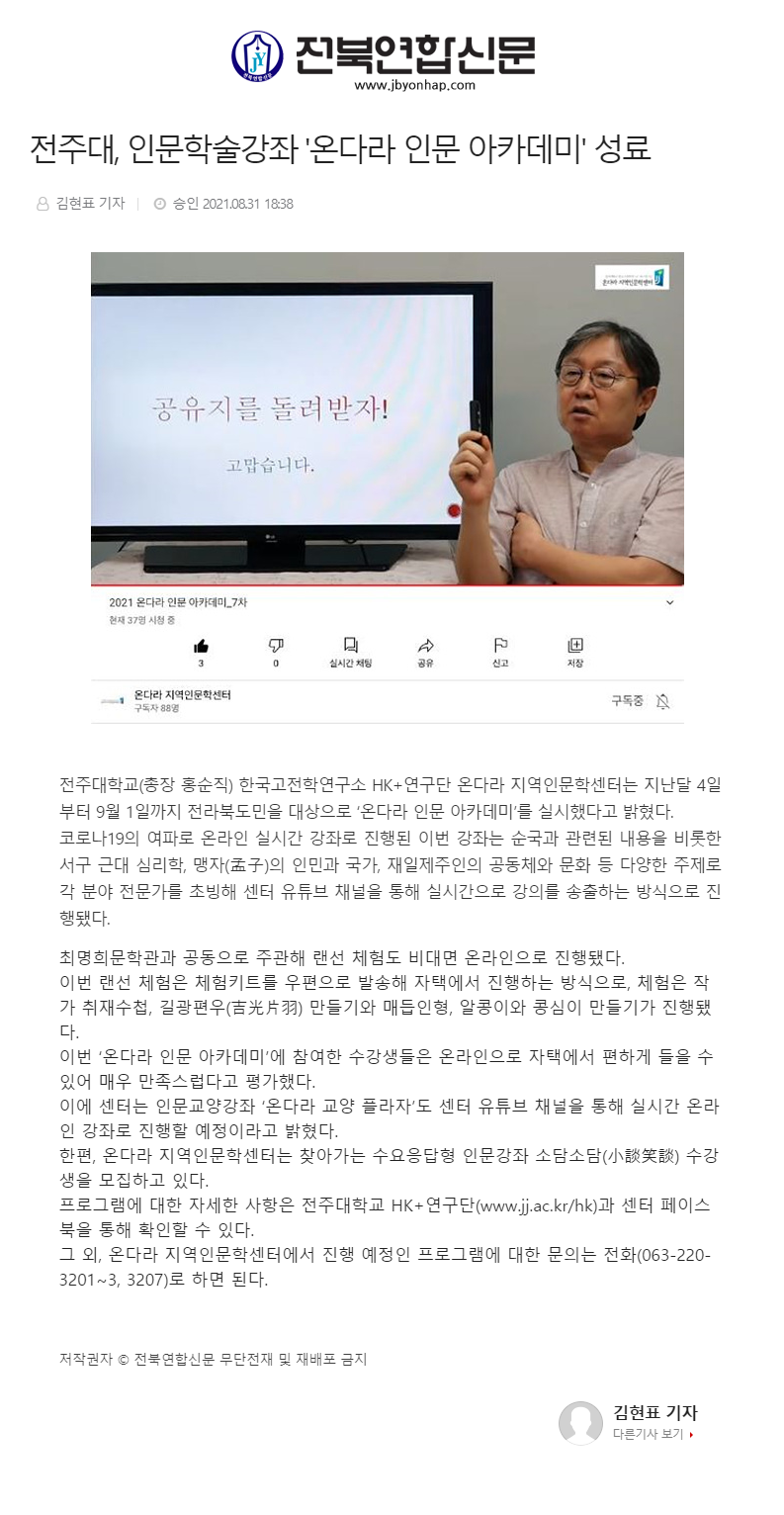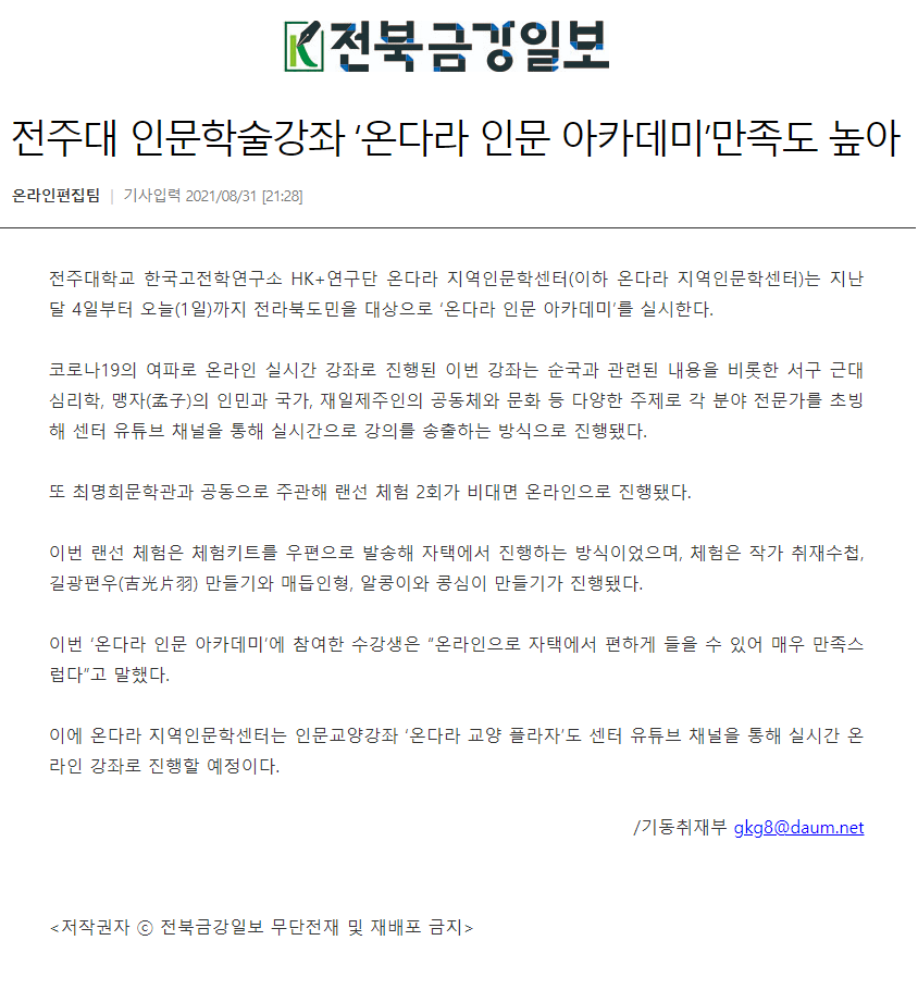 | 410 | 기타 | 전주대 인문학술강좌 '온다라 인문 아카데미' 만족도 높아 | 온다라 지역인문학센터 | 21-09-08 | 213 |