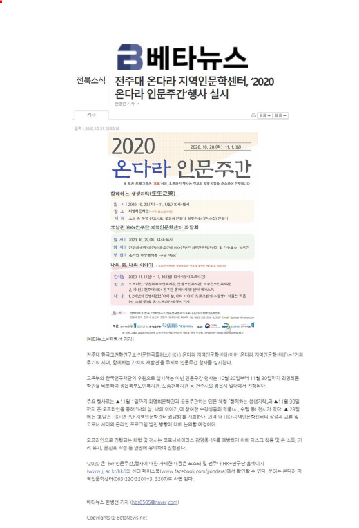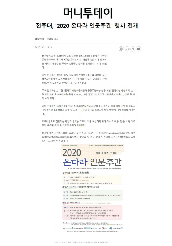 | 301 | 기타 | 전주대 온다라 지역인문학센터, ‘2020 온다라 인문주간’ 행사 진행 | 온다라 지역인문학센터 | 20-10-23 | 220 |