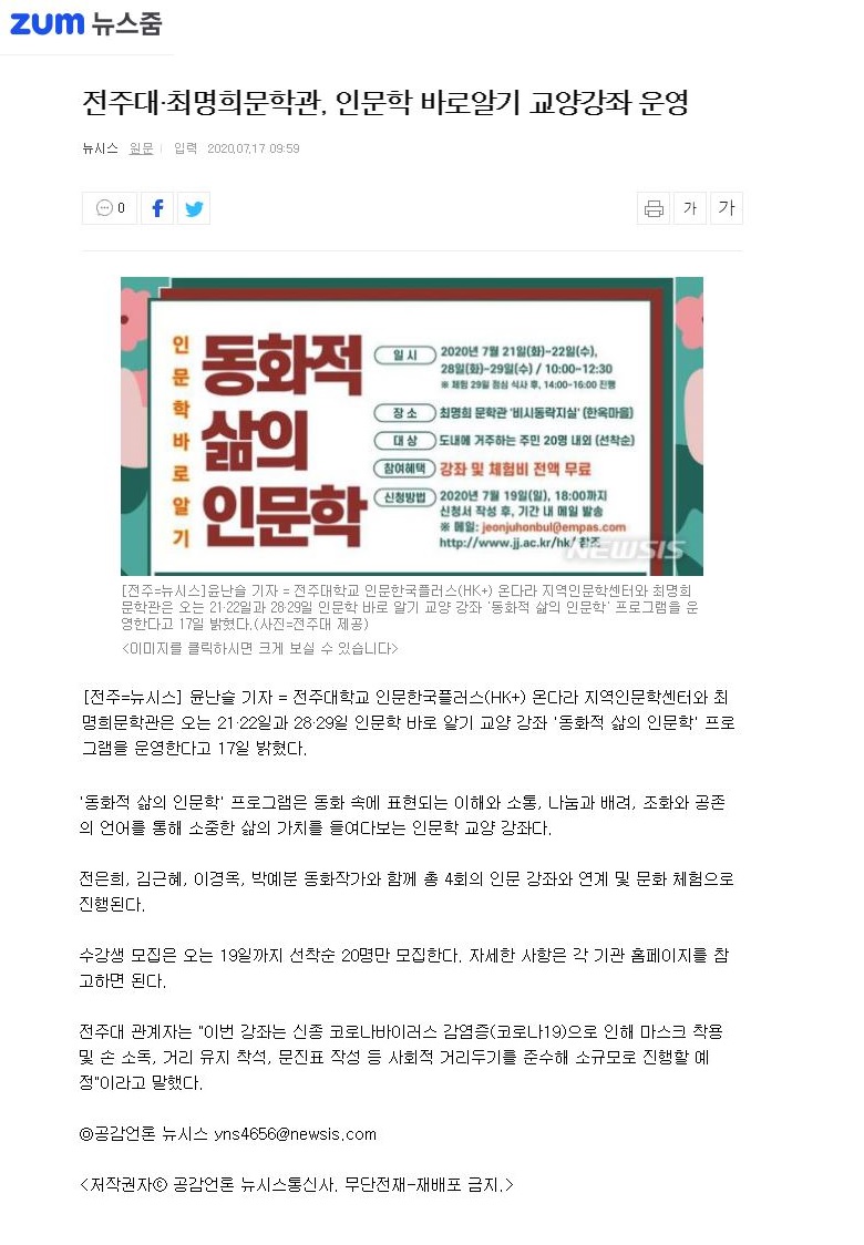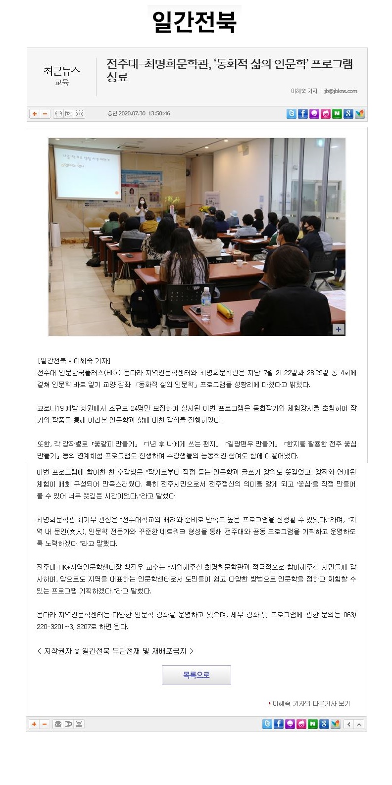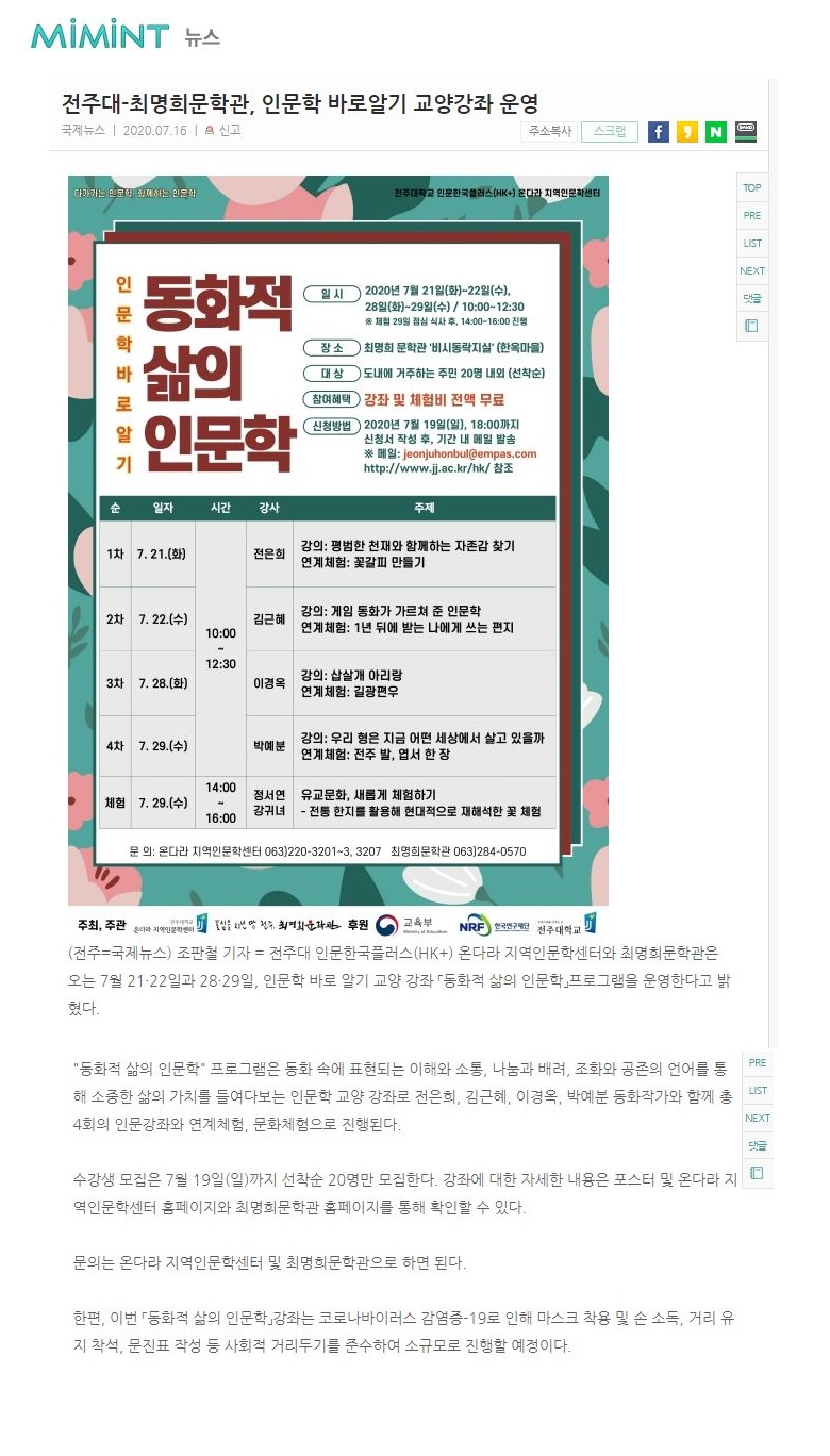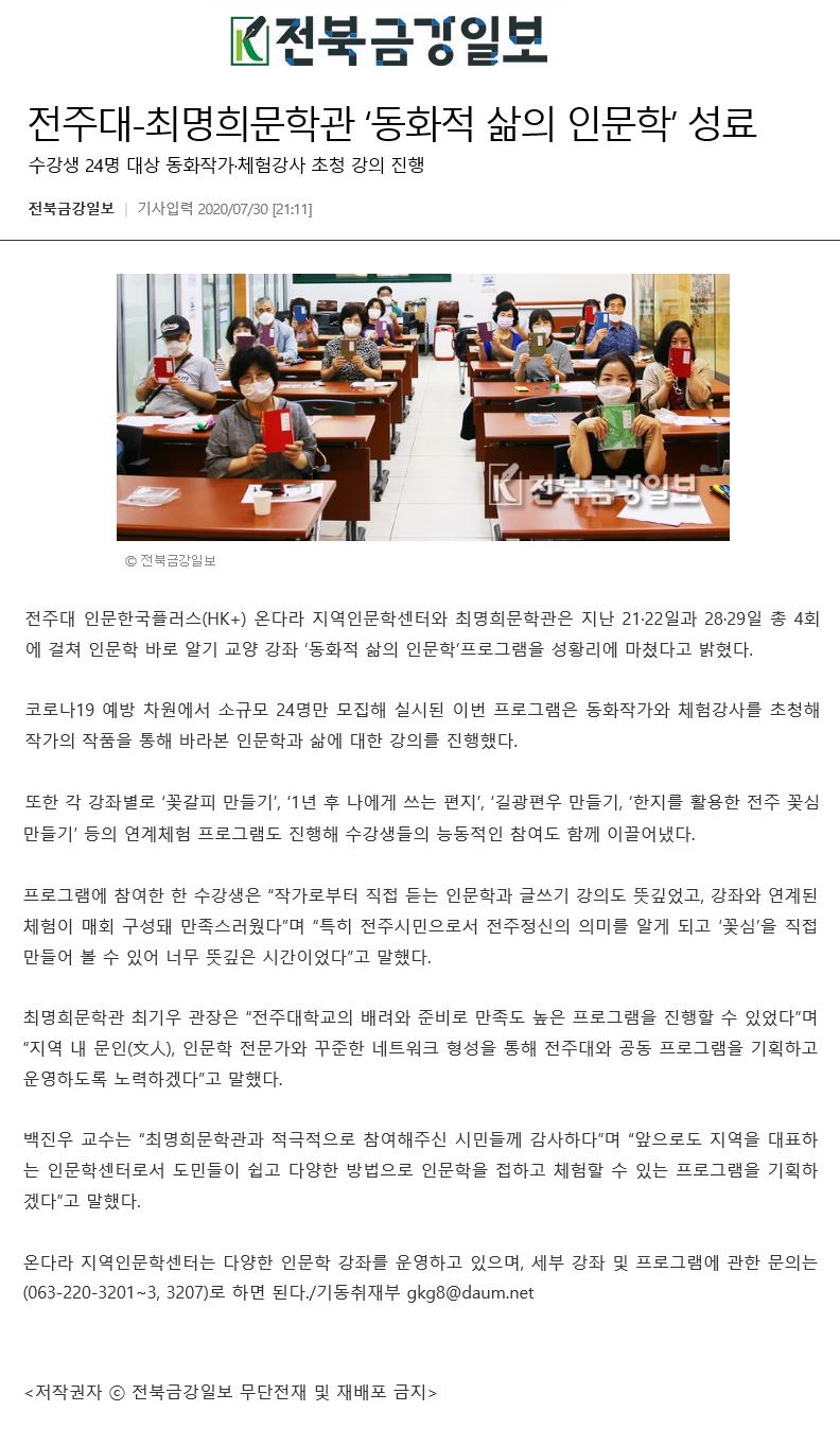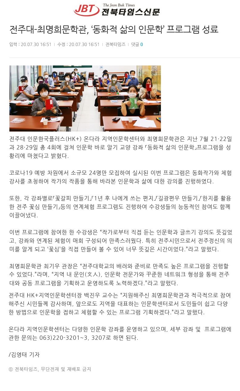 | 288 | 기타 | 전주대-최명희문학관 '동화적 삶의 인문학' 프로그램 성료 | 온다라 지역인문학센터 | 20-08-03 | 217 |