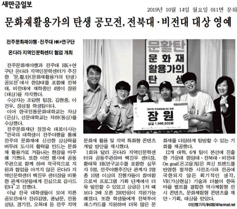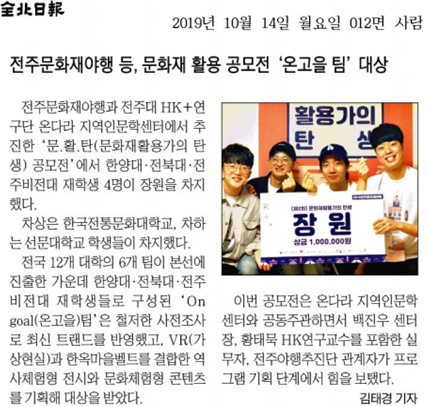 | 220 | 기타 | 문화재활용가의 탄생 공모전, 전북대·비전대 대상 영예 | 온다라 지역인문학센터 | 20-02-27 | 232 |