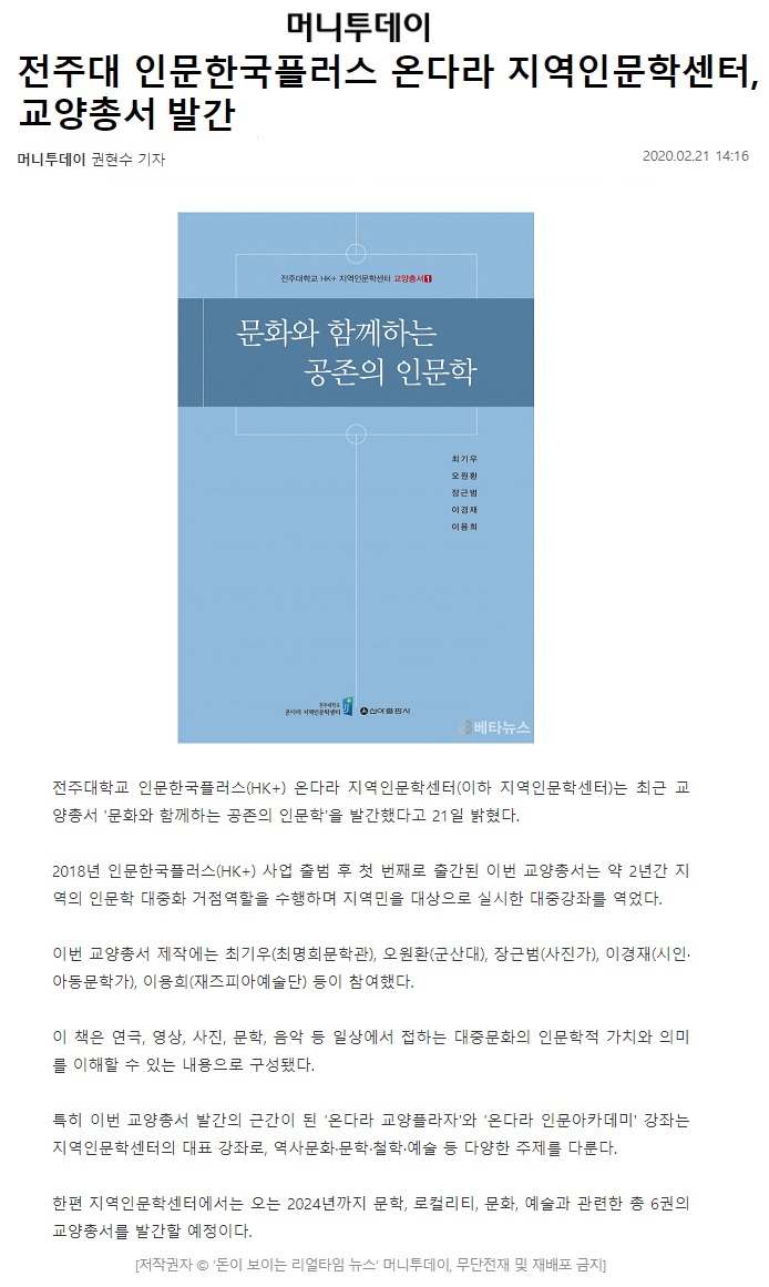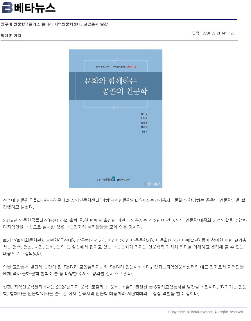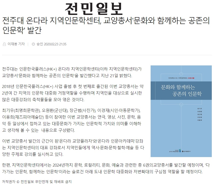 | 225 | 기타 | 전주대 온다라 지역인문학센터, 교양총서'문화와 함께하는 공존의 인문학' 발간 | 온다라 지역인문학센터 | 20-02-27 | 260 |