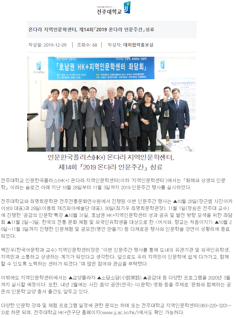 | 222 | 기타 | 온다라 지역인문학센터, 제 14회 2019인문주간 성료 | 온다라 지역인문학센터 | 20-02-27 | 226 |