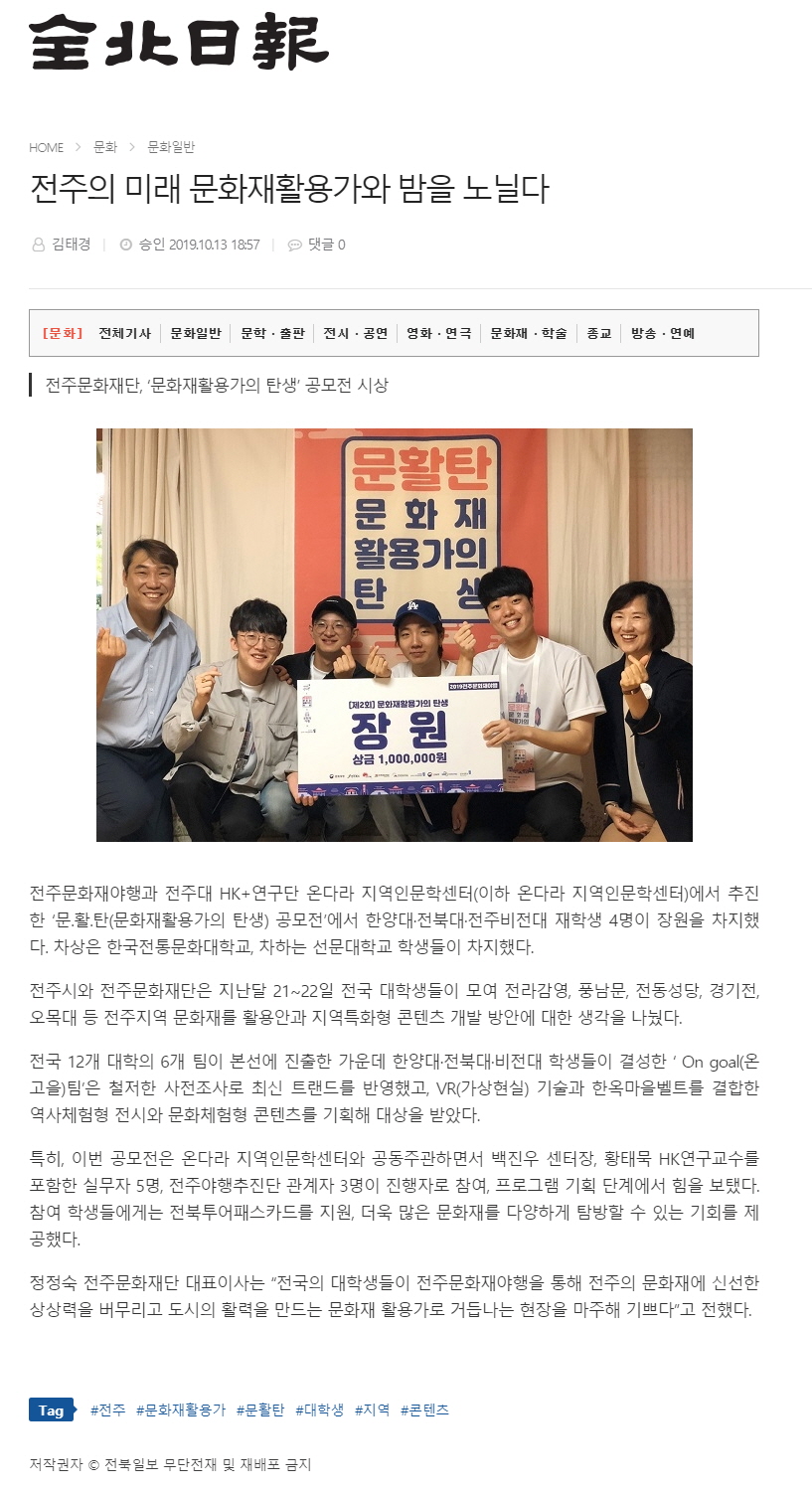 | 205 | 기타 | 전주의 미래 문화재활용가와 밤을 노닐다 | 온다라 지역인문학센터 | 20-01-31 | 249 |