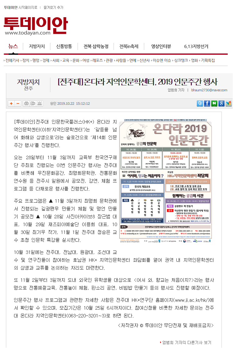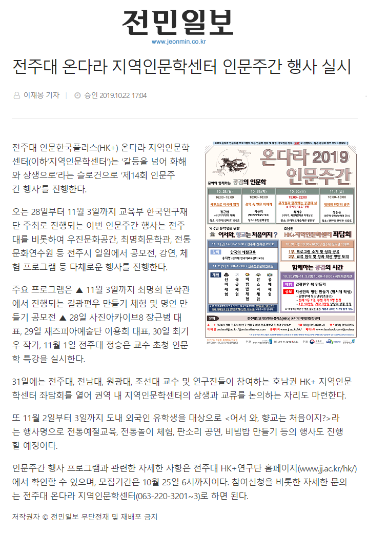 [전주대]온다라 지역인문학센터, 2019 인문주간 행사