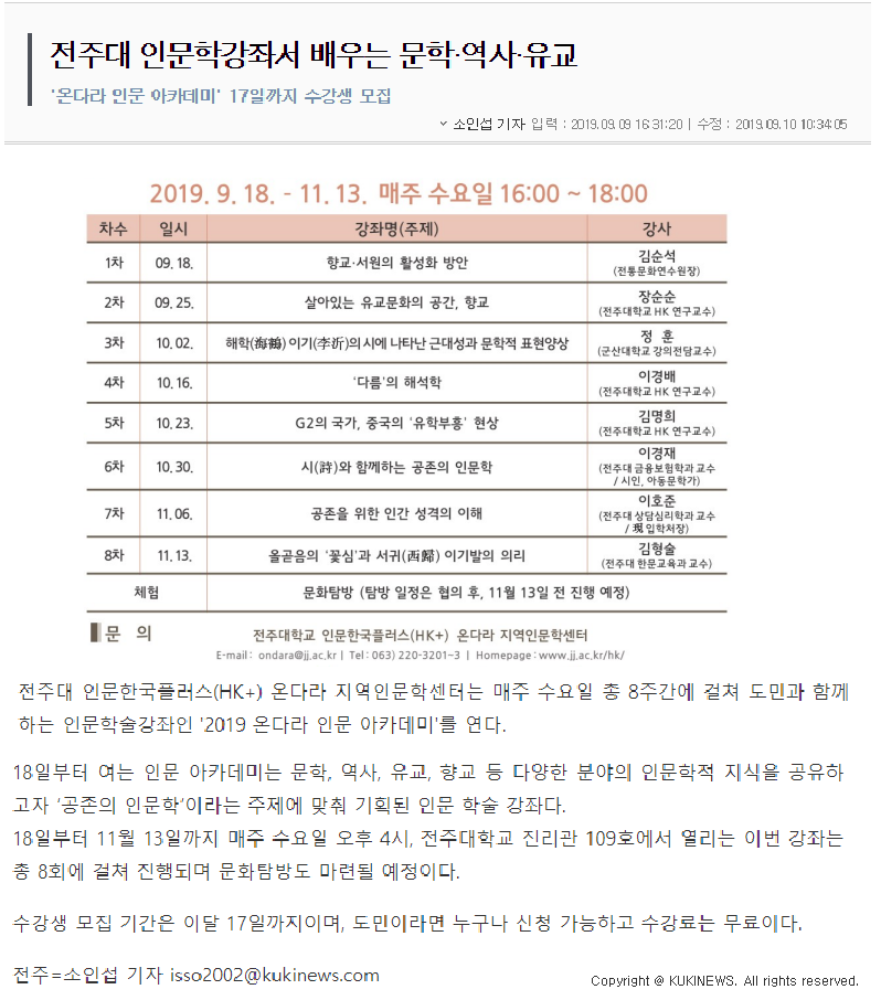 | 184 | 기타 | 전주대 인문학강좌서 배우는 문학·역사·유교 | 온다라 지역인문학센터 | 19-09-11 | 221 |