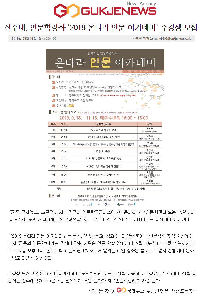 | 185 | 기타 | 전주대, 인문학강좌 '2019 온다라 인문 아카데미' 수강생 모집 | 온다라 지역인문학센터 | 19-09-11 | 277 |