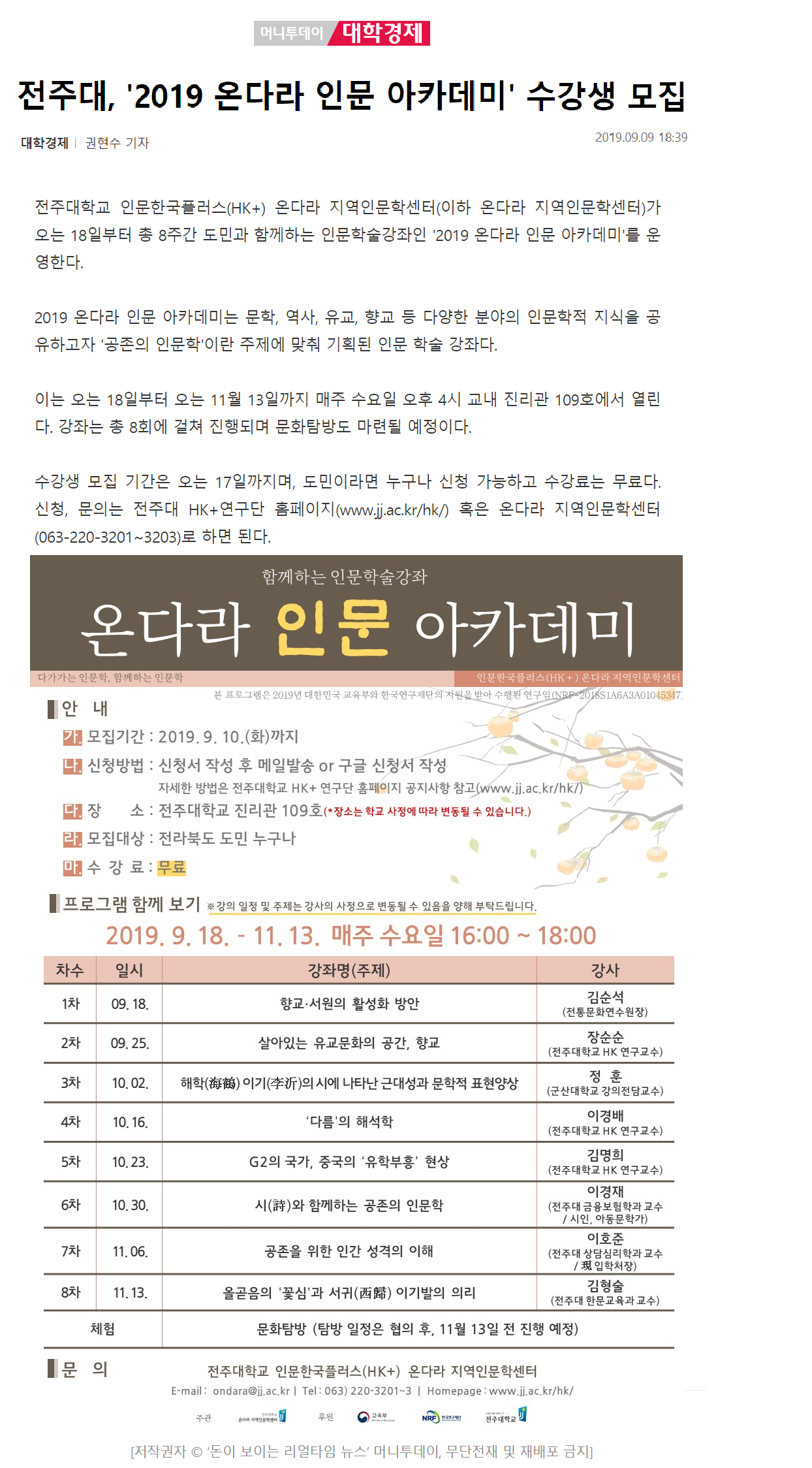 전주대, '2019온다라 인문 아카데미' 수강생 모집