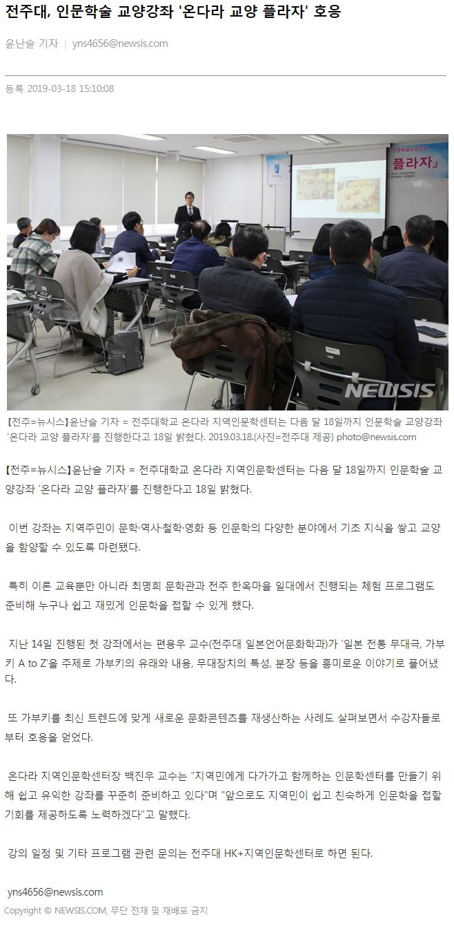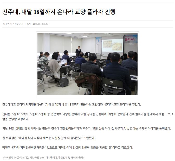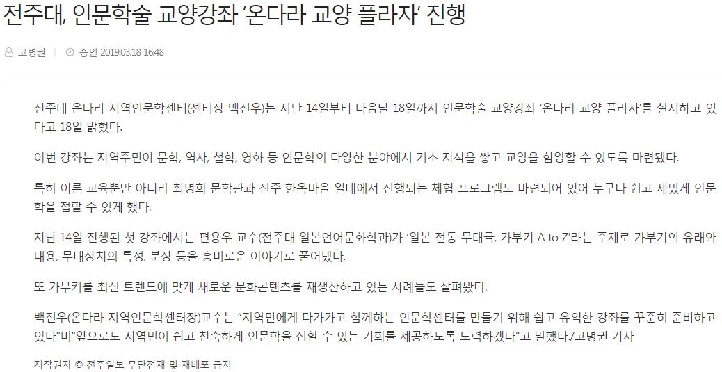 | 139 | 기타 | 전주대, 인문학술 교양강좌 '온다라 교양 플라자' 호응 | 온다라 지역인문학센터 | 19-08-11 | 234 |