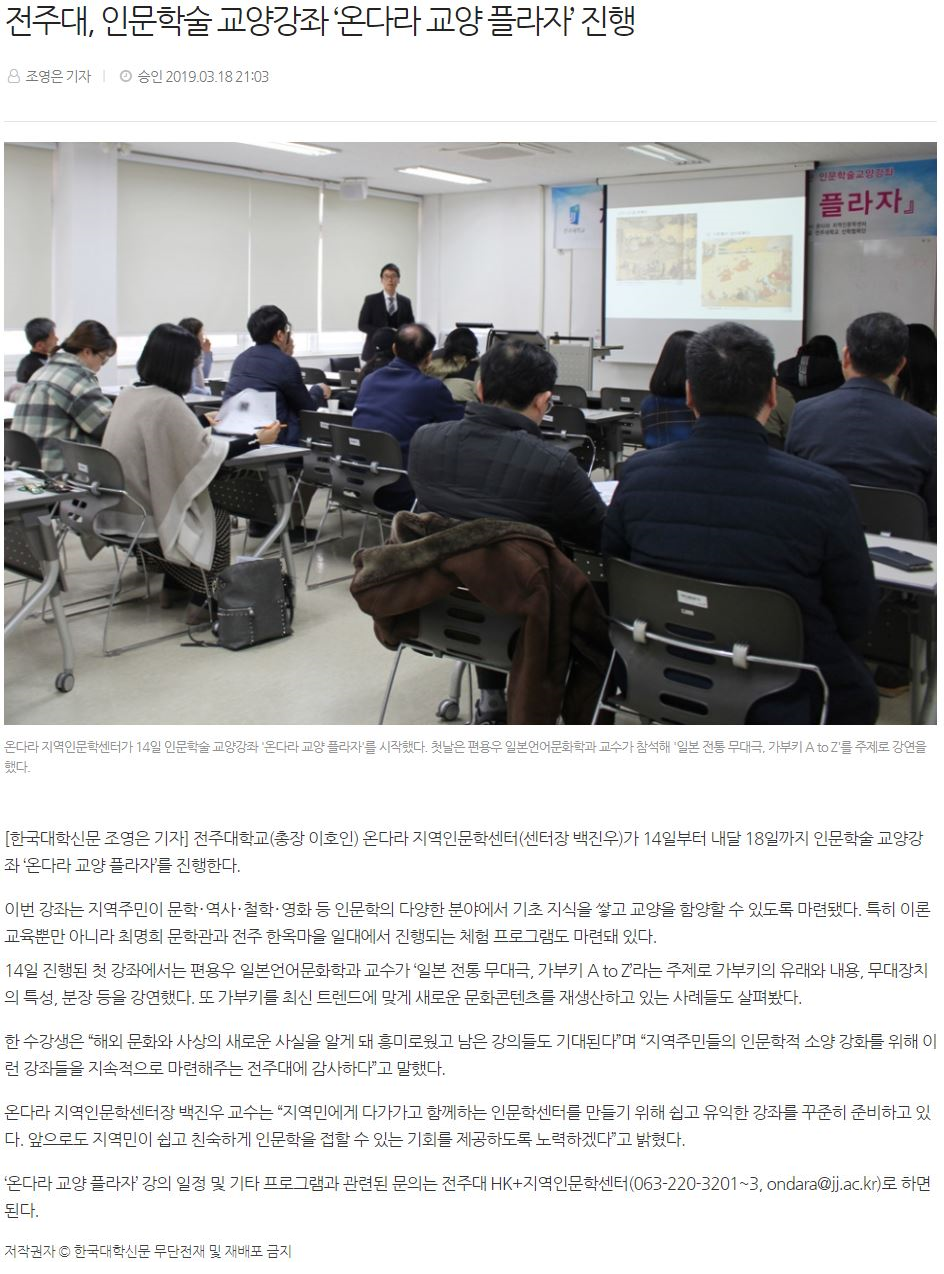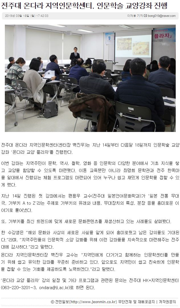 | 145 | 기타 | 전주대, 인문학술 교양강좌 ‘온다라 교양 플라자’ 진행 | 온다라 지역인문학센터 | 19-08-11 | 234 |