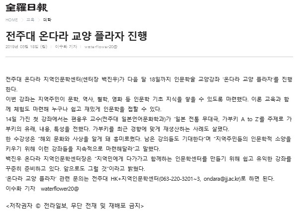 | 141 | 기타 | 전주대, 내달 18일까지 온다라 교양 플라자 진행 | 온다라 지역인문학센터 | 19-08-11 | 220 |