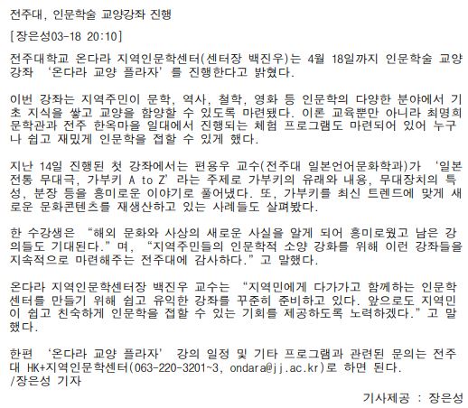 | 147 | 기타 | 전주대, 인문학술 교양강좌 '온다라 교양 플라자' 진행 | 온다라 지역인문학센터 | 19-08-11 | 227 |