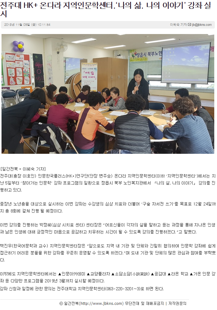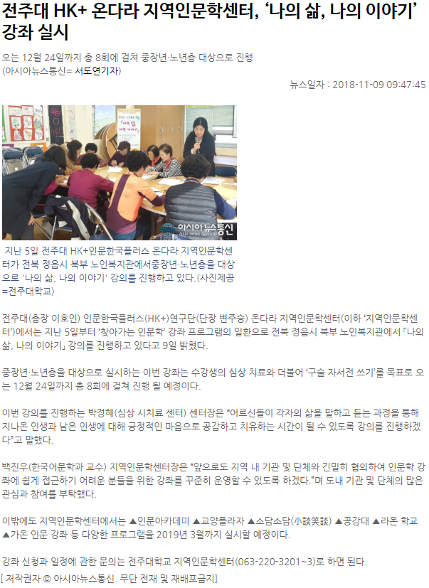 전주대 HK+ 온다라 지역인문학센터, ‘나의 삶, 나의 이야기’ 강좌 실시