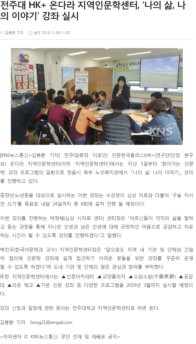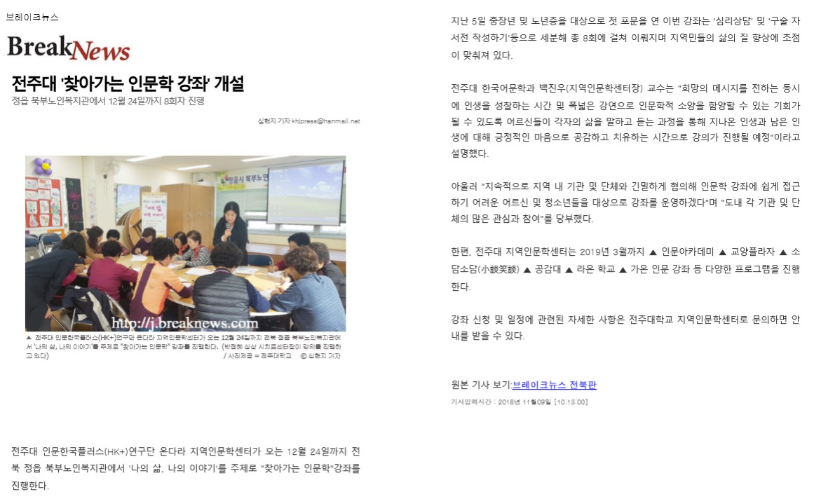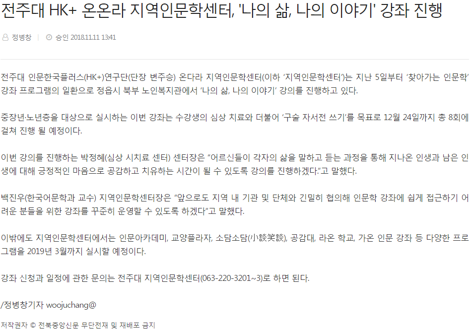| 99 | 기타 | 전주대 HK+ 온다라 지역인문학센터, ‘나의 삶, 나의 이야기’ 강좌 실시 | 온다라 지역인문학센터 | 19-08-10 | 245 |